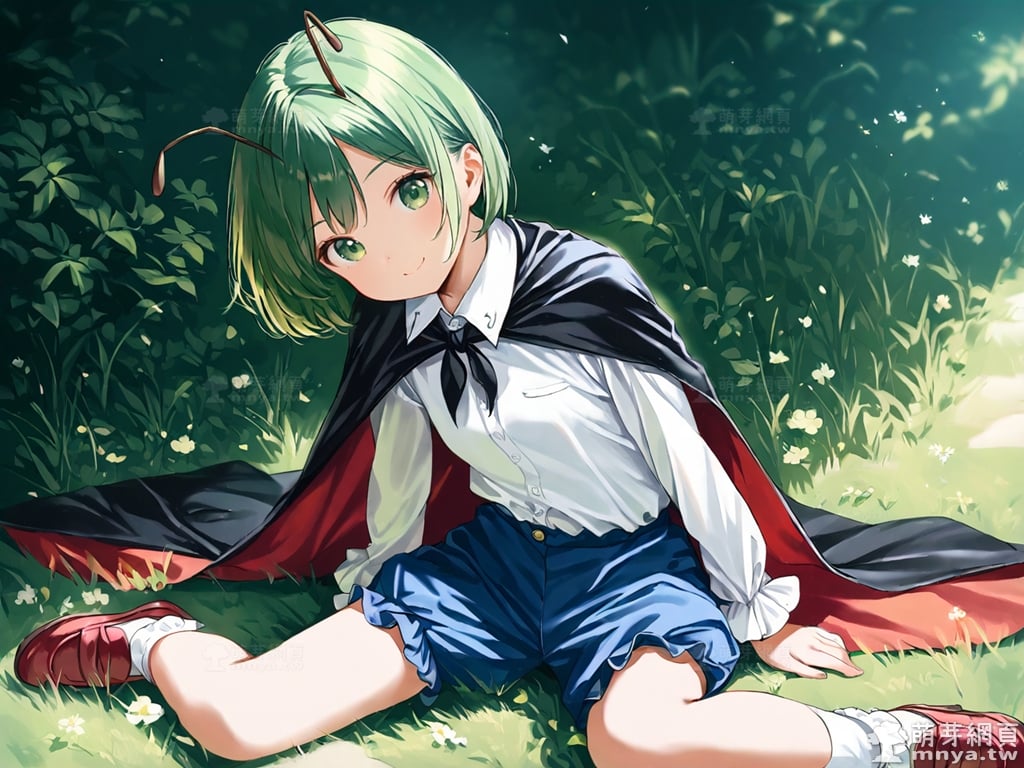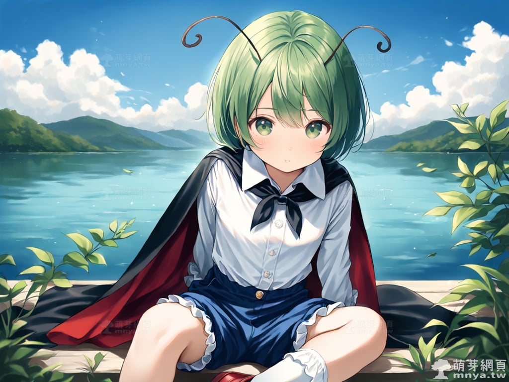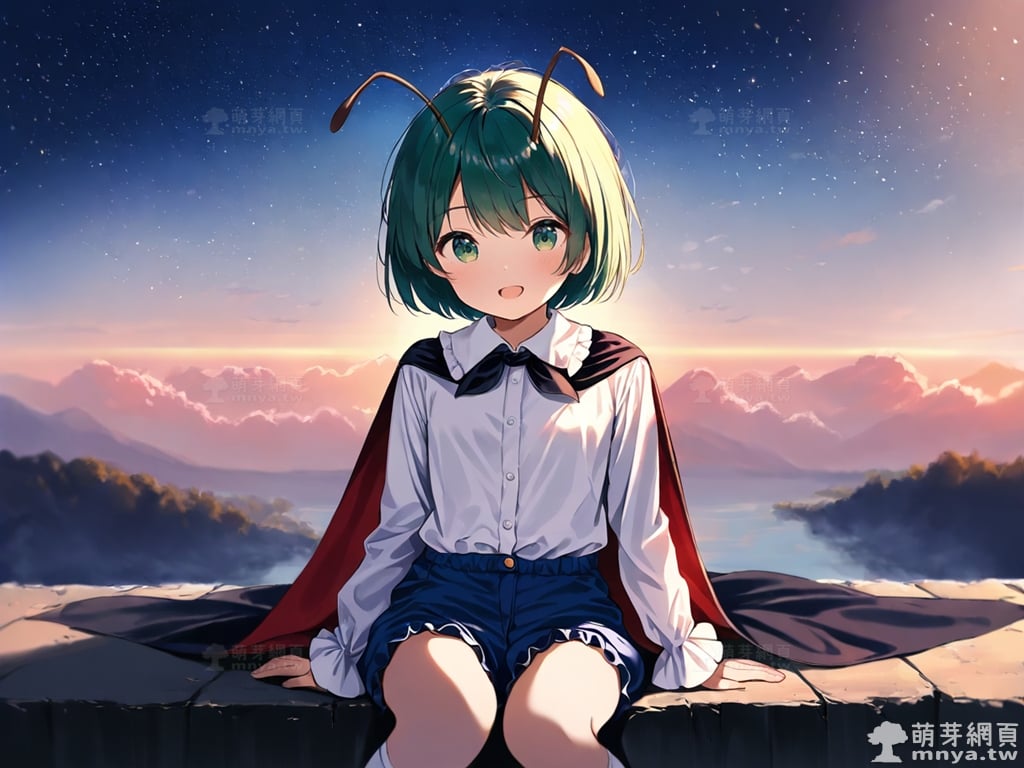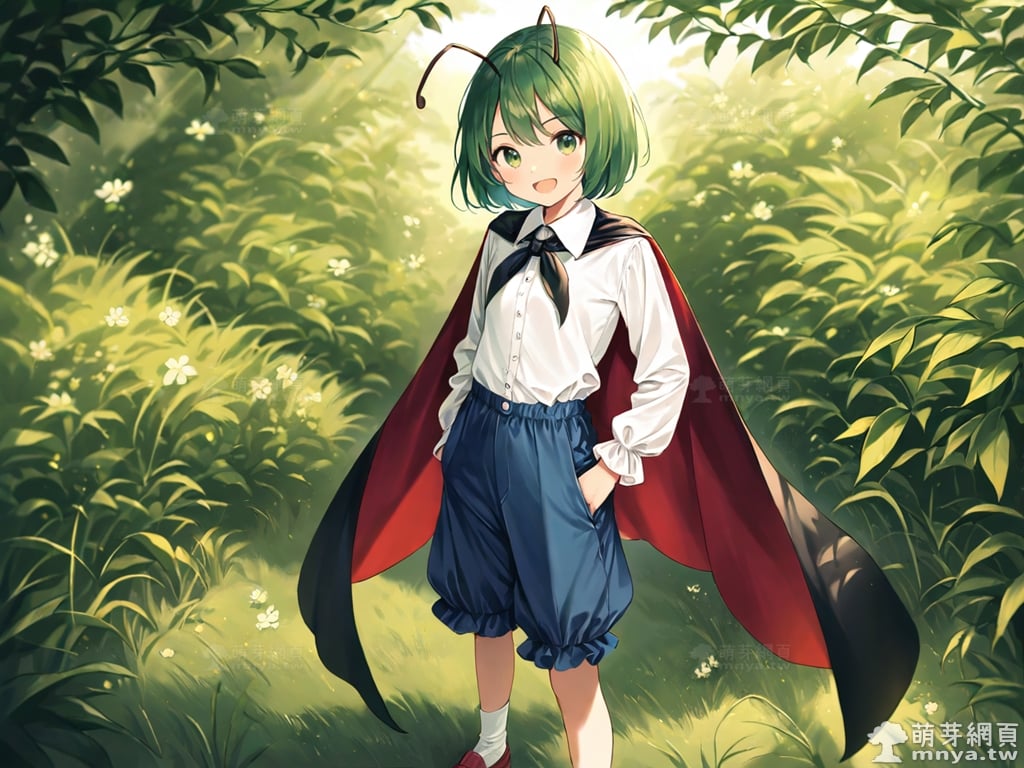 提詞文字:(masterpiece), (high quality), (high score), (great score), (year 2020), (kawaii), (loli), (photorealistic:0.1), 1girl, solo, (wriggle nightbug), touhou, __posture__, short hair, green hair, green eyes, antennae, black cape, blue shorts, buttons, cape, collared shirt, frilled sleeves, long sleeves, red cape, shirt, shirt tucked in, bloomers, shorts, socks, two-sided cape, two-sided fabric, white socks, loafers, shoes, red shoes, small breasts, breasts, cowboy shot, __looking__, __expression__, __background__.