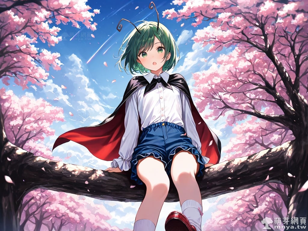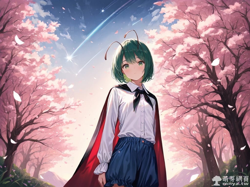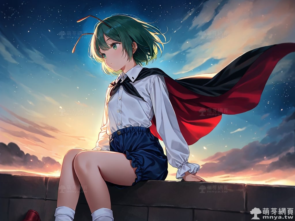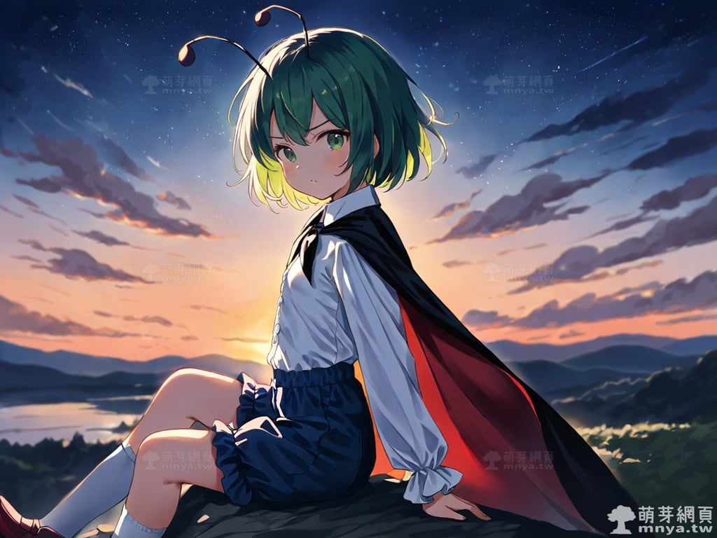 提詞文字:(masterpiece), (high quality), (high score), (great score), (year 2020), (kawaii), (loli), (photorealistic:0.1), 1girl, solo, (wriggle nightbug), touhou, __posture__, short hair, green hair, green eyes, antennae, black cape, blue shorts, buttons, cape, collared shirt, frilled sleeves, long sleeves, red cape, shirt, shirt tucked in, bloomers, shorts, socks, two-sided cape, two-sided fabric, white socks, loafers, shoes, red shoes, small breasts, breasts, cowboy shot, __looking__, __expression__, __background__.
