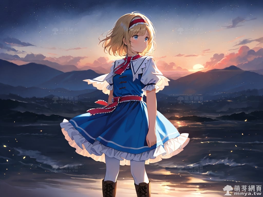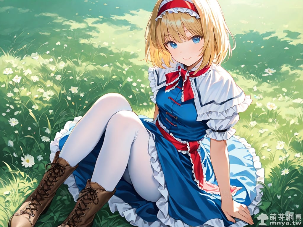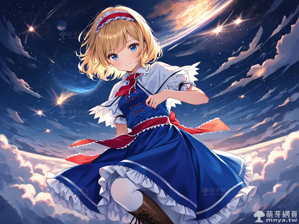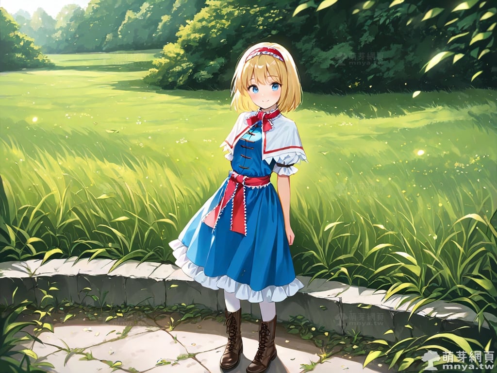 提詞文字:(masterpiece), (high quality), (high score), (great score), (year 2020), (kawaii), (loli), (photorealistic:0.1), 1girl, solo, (alice margatroid), touhou, __posture__, short hair, blonde hair, red hairband, lolita hairband, frilled hairband, hairband, blue eyes, blue dress, capelet, dress, frilled dress, frilled capelet, frilled sash, frills, pantyhose, puffy short sleeves, puffy sleeves, red sash, sash, short sleeves, waist sash, white capelet, white pantyhose, lace-up boots, shoes, boots, brown boots, medium breasts, breasts, cowboy shot, __looking__, __expression__, __background__.