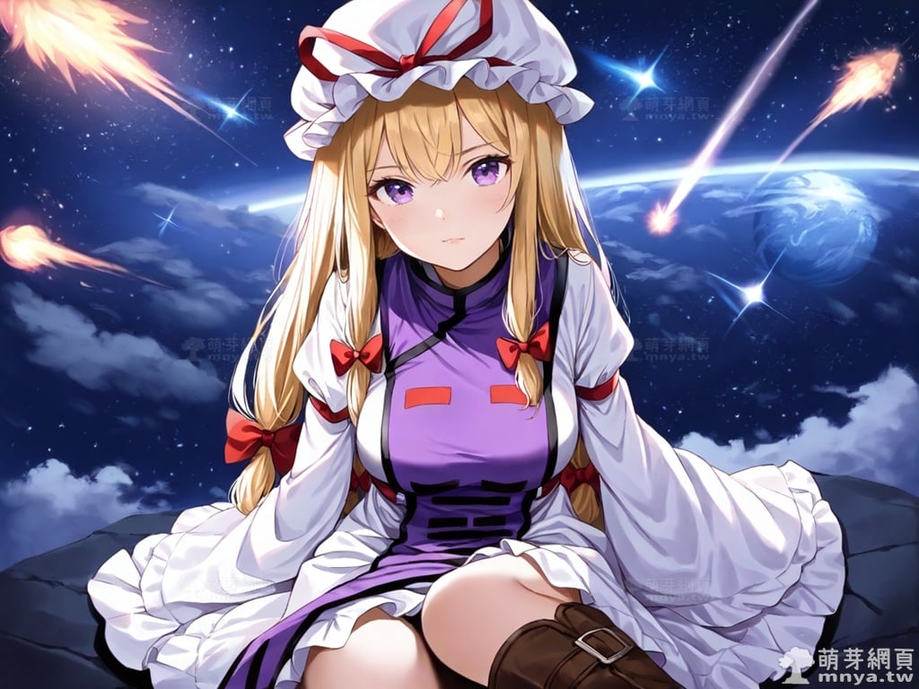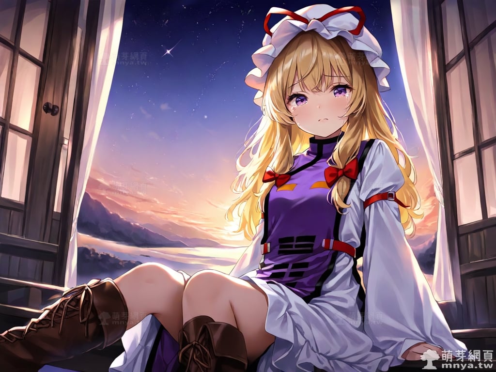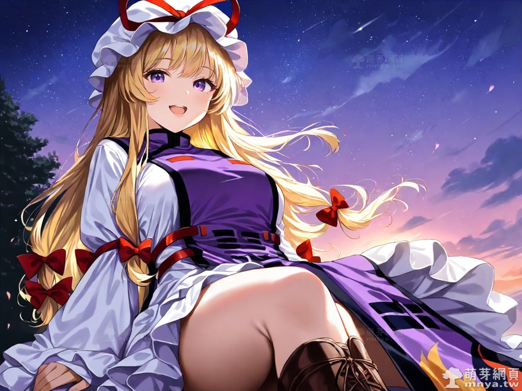 提詞文字:(masterpiece), (high quality), (high score), (great score), (year 2020), (kawaii), (loli), (photorealistic:0.1), 1girl, solo, (yakumo yukari), touhou, __posture__, long hair, blonde hair, purple eyes, boots, bow, brown boots, dress, flame print, hair bow, hat, long sleeves, mob cap, multiple hair bows, purple tabard, red bow, sleeves past wrists, tabard, white dress, white hat, white sleeves, wide sleeves, yin yang, large breasts, breasts, cowboy shot, __looking__, __expression__, __background__.