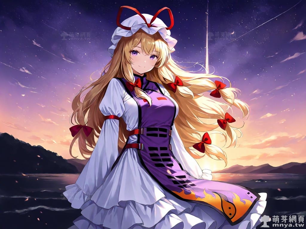 東方Project角色 AI 圖畫第一百七十八彈,此次的目標是「東方妖妖夢~ Perfect Cherry Blossom.」初次登場的「八雲紫」(八雲 紫,Yakumo Yukari),一位力量強大的隙間妖怪,同時也是幻想鄉的創始人之一,長年與歷代博麗巫女共同維護著博麗大結界。她有著與根源相關的危險能力,足以與神明匹敵,是少數深知幻想鄉本質並極端珍愛它的存在。八雲紫通常在傍晚到半夜活動,白天則會睡上十幾個小時,甚至會在冬天冬眠,因此多數時候,她會將雜務交給她的妖獸式神八雲藍處理,由藍代理她的一切行動。從外型上看,她擁有一頭金色的長髮,通常被束成多個馬尾並繫上紅色的蝴蝶結,顯得格外有特色。一雙紫色的眼瞳深邃而神秘,彷彿能洞悉一切。她的外表為御姐形象,身上穿著華麗的連衣裙,裙襬和袖口點綴著精緻的荷葉邊,再配上繫著蝴蝶結的帽子,整體打扮優雅又不失俏皮。八雲紫的朋友多半是西行寺幽幽子、伊吹萃香等最強等級的妖怪,但因為其難以捉摸的性格,除了博麗靈夢之外,鮮少有人能與她認真相處。她的彈幕名常以相對的概念為主題,如生與死、夢境與現實,而她與現世人類秘封俱樂部成員瑪艾露貝莉·赫恩之間,似乎存在著類似莊周夢蝶般的奇妙關係。使用 SDXL 模型直接生成,效果很不錯。總共產生 100 張,挑掉不合理跟瑕疵較多的有 7 張如下提供大家參考。