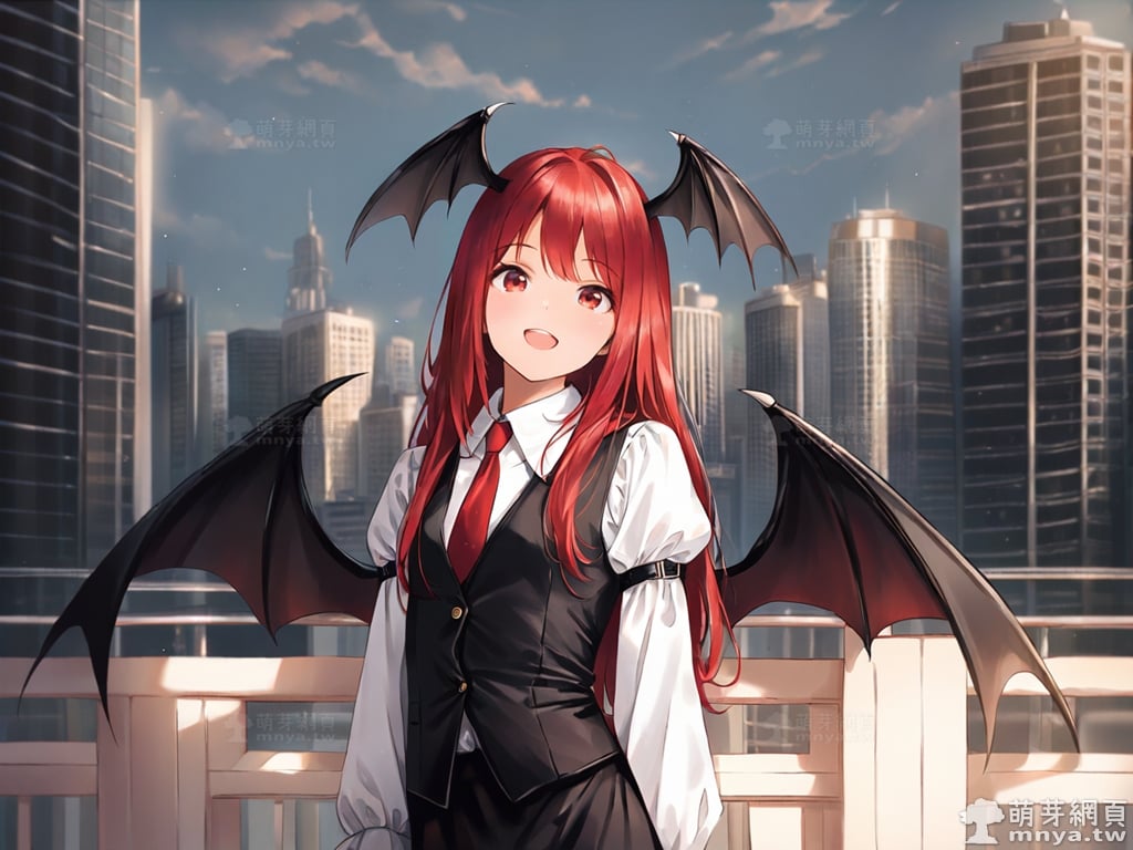 提詞文字:(masterpiece), (high quality), (high score), (great score), (year 2020), (kawaii), (loli), (photorealistic:0.1), 1girl, solo, (koakuma), touhou, __posture__, long hair, red hair, red eyes, black skirt, black vest, black wings, collared shirt, demon wings, head wings, juliet sleeves, long sleeves, necktie, puffy sleeves, red necktie, shirt, skirt, vest, white shirt, wings, small breasts, breasts, cowboy shot, __looking__, __expression__, __background__.