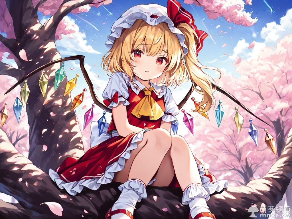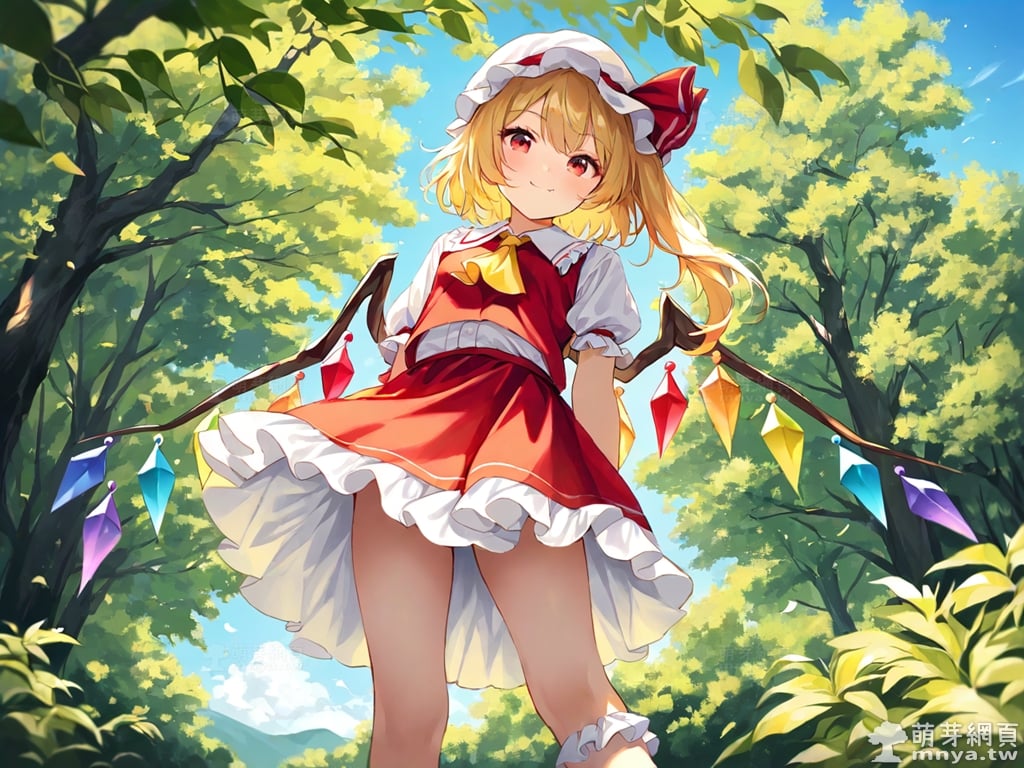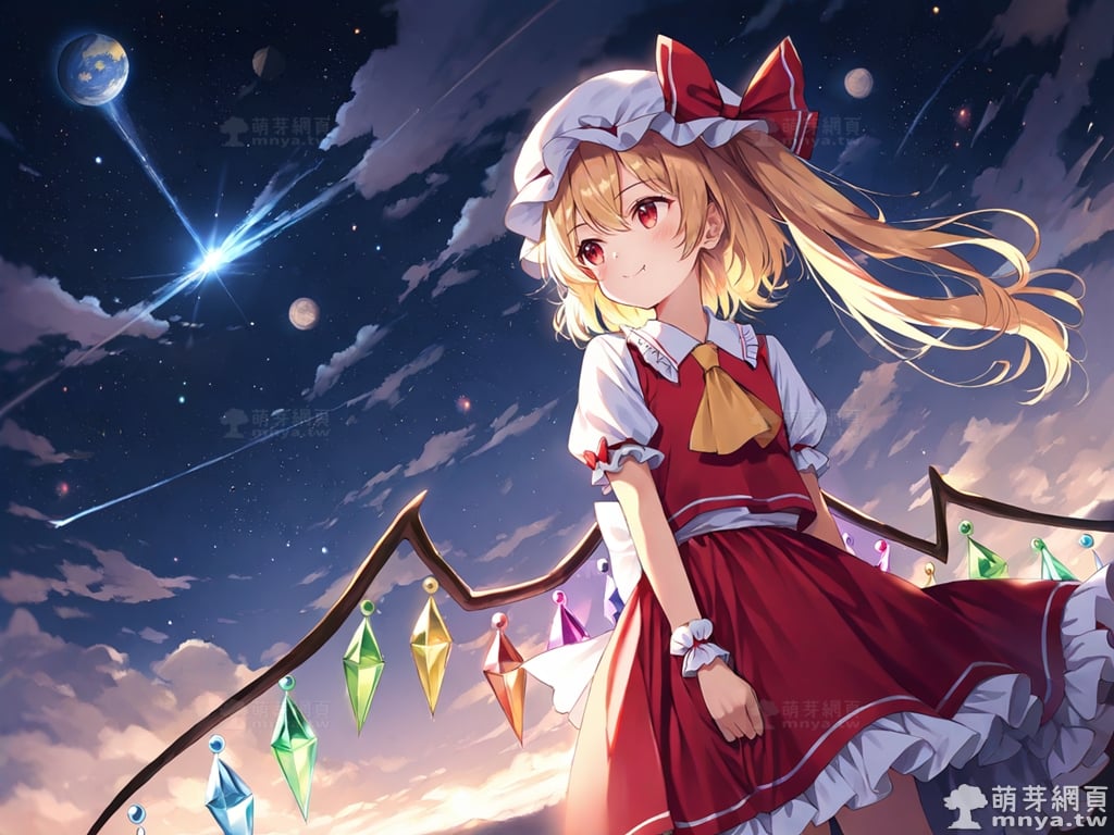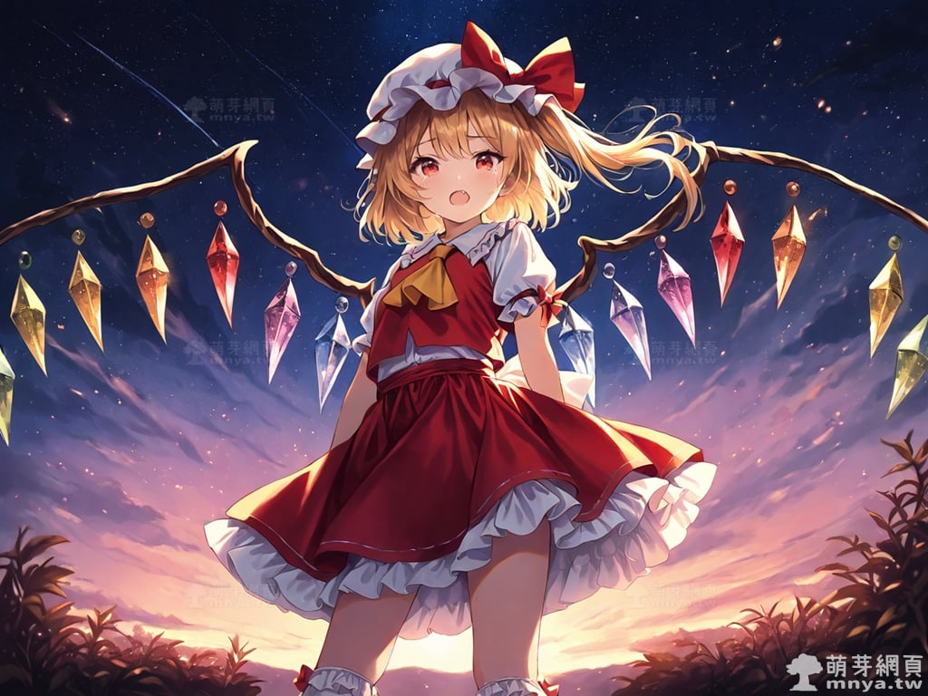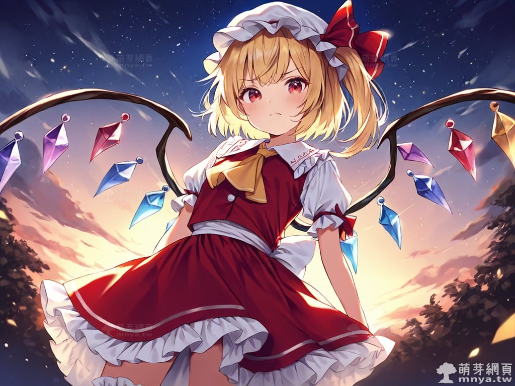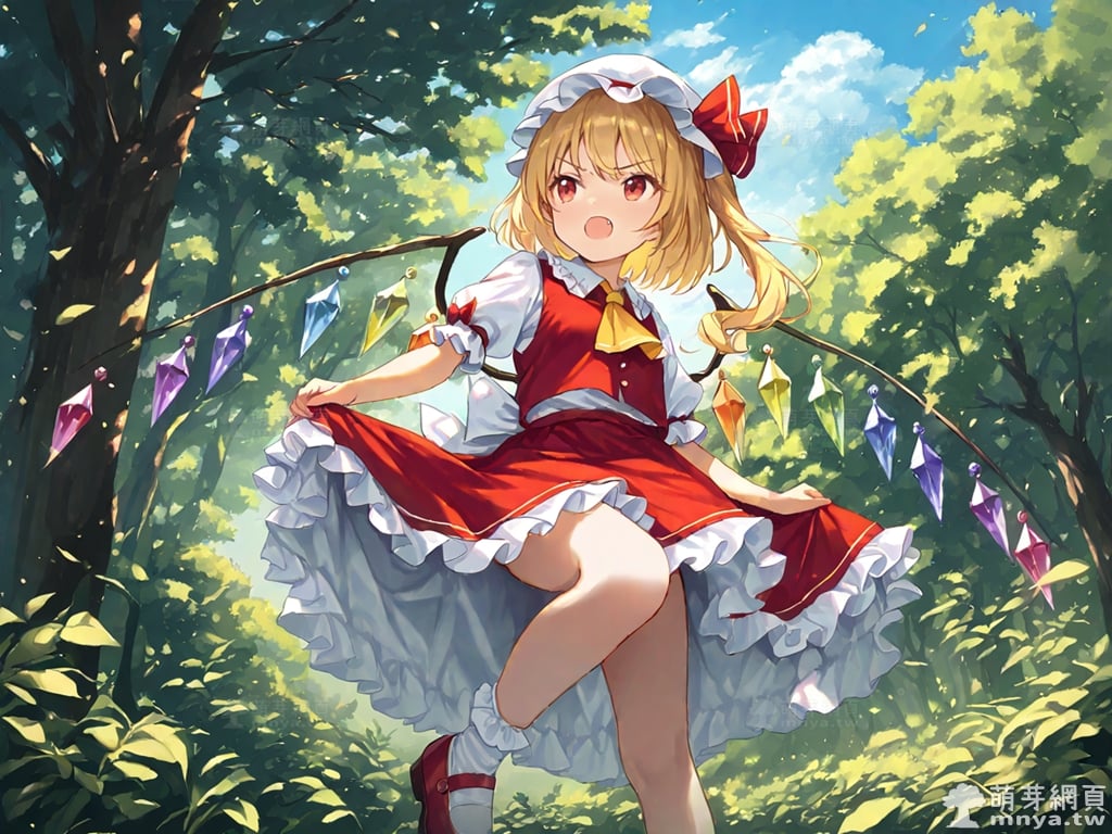 東方Project角色 AI 圖畫第一百八十六彈,此次的目標是「東方紅魔鄉~ the Embodiment of Scarlet Devil.」初次登場的「芙蘭朵露・斯卡蕾特」(フランドール・スカーレット,Flandre Scarlet),超過 495 歲的吸血鬼,同時也是紅魔館主人蕾米莉亞·斯卡蕾特的妹妹。她擁有能夠破壞所有存在之物的強大能力,但由於精神和思維似乎不太正常,且破壞力難以抑制,因此長年被姊姊關在紅魔館的地下室。不過,本人對此表示滿意,並不覺得自己是被關起來。在形象上,她有著一頭亮麗的金髮,通常以半馬尾的造型呈現,配上帶有荷葉邊的白色帽子,顯得活潑可愛。她的雙眸為引人注目的紅色,眼神中透露著一絲神秘與天真。此外,她背後懸掛著由七彩水晶組成的翅膀,這是她最大的特徵。儘管外表是蘿莉體型,看起來無害,但她符卡多帶有「禁忌」的字眼,透露出不為人知的危險氣息,而人類對她而言只是點心,不過她本人對此一無所知。使用 SDXL 模型直接生成,效果很不錯。總共產生 100 張,挑掉不合理跟瑕疵較多的有 11 張如下提供大家參考。