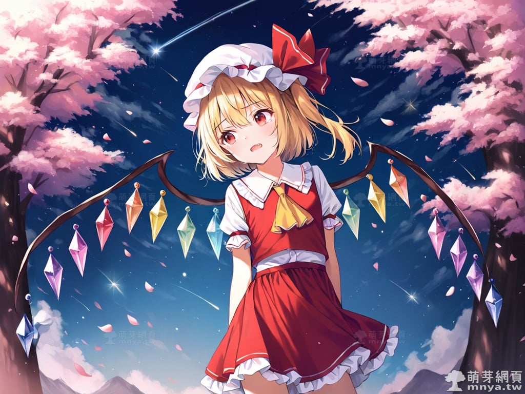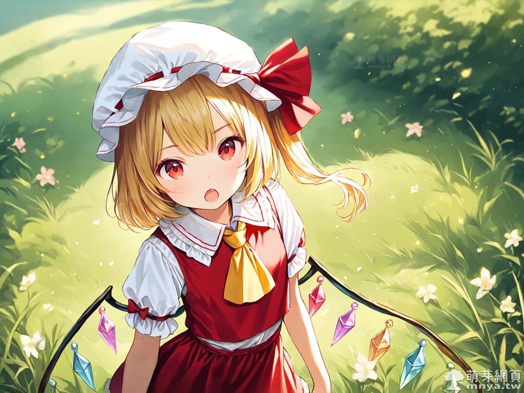 提詞文字:(masterpiece), (high quality), (high score), (great score), (year 2020), (kawaii), (loli), (photorealistic:0.1), 1girl, solo, (flandre scarlet), touhou, __posture__, blonde hair, side ponytail, one side up, mob cap, hat, white hat, red eyes, yellow ascot, ascot, crystal wings, dress, fang, frilled socks, frills, mary janes, puffy short sleeves, puffy sleeves, red vest, vest, red dress, short sleeves, shirt, white shirt, socks, white socks, wings, red shoes, shoes, small breasts, breasts, cowboy shot, __looking__, __expression__, __background__.