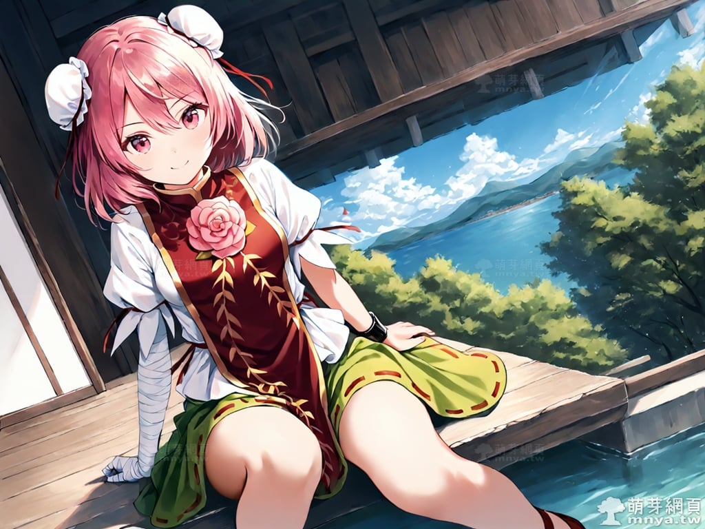 提詞文字:(masterpiece), (high quality), (high score), (great score), (year 2020), (kawaii), (loli), (photorealistic:0.1), 1girl, solo, (ibaraki kasen), touhou, __posture__, short hair, pink hair, bun cover, hair bun, double bun, hair between eyes, pink eyes, bandaged arm, bandages, green skirt, pink flower, print tabard, puffy short sleeves, puffy sleeves, red ribbon, red shoes, red tabard, ribbon, shirt, shoes, short sleeves, skirt, tabard, white shirt, medium breasts, breasts, cowboy shot, __looking__, __expression__, __background__.