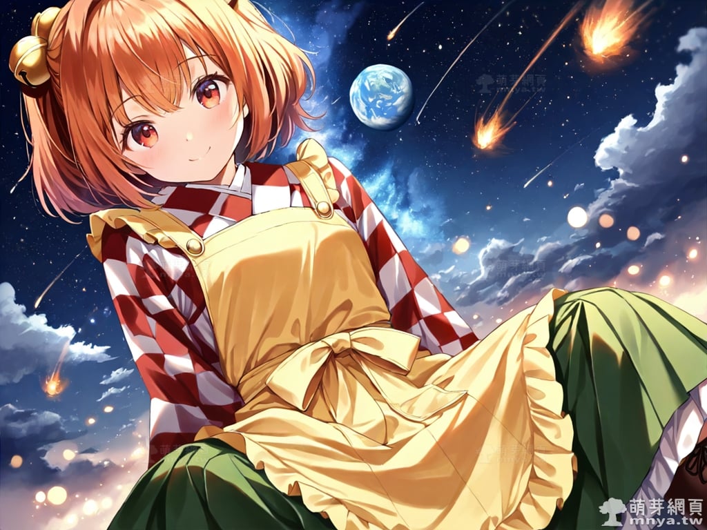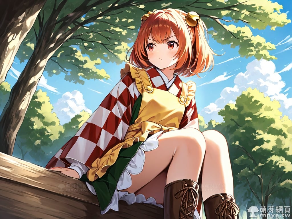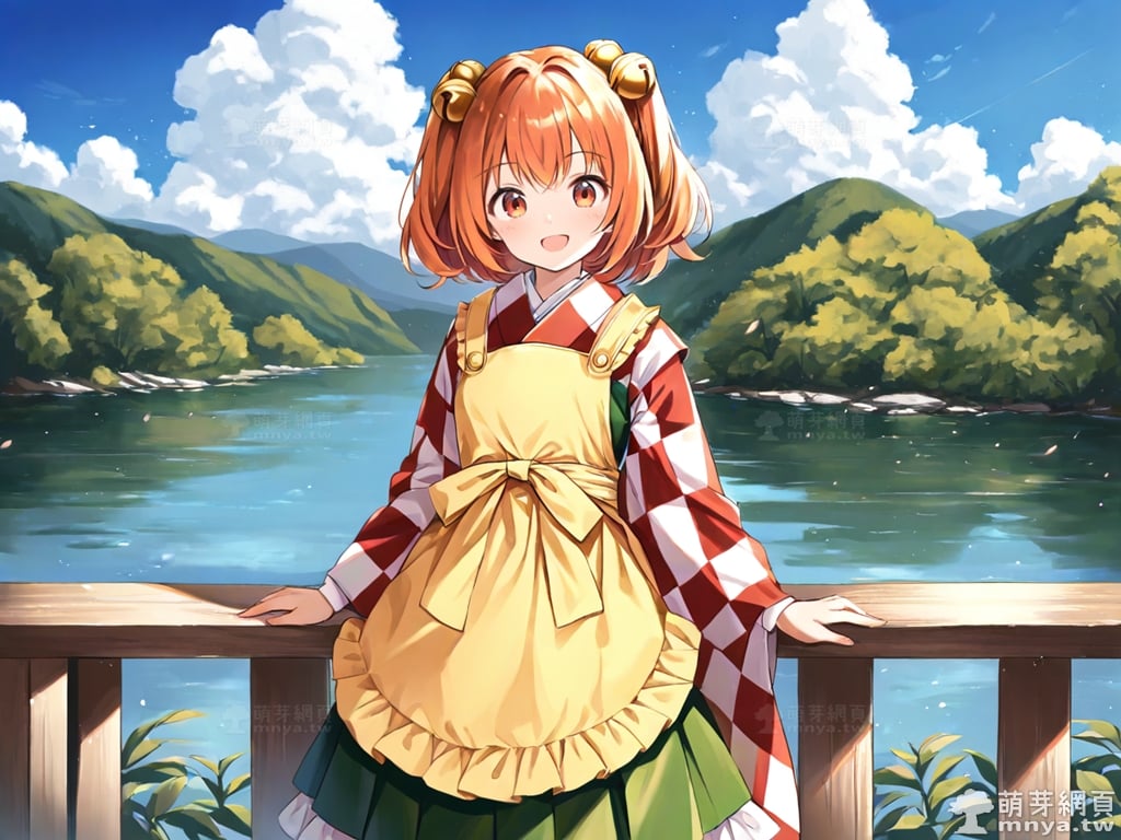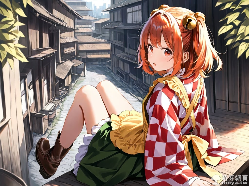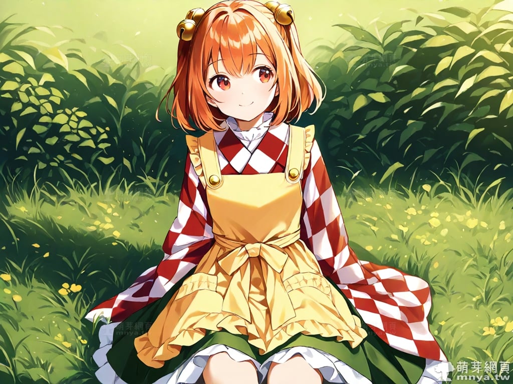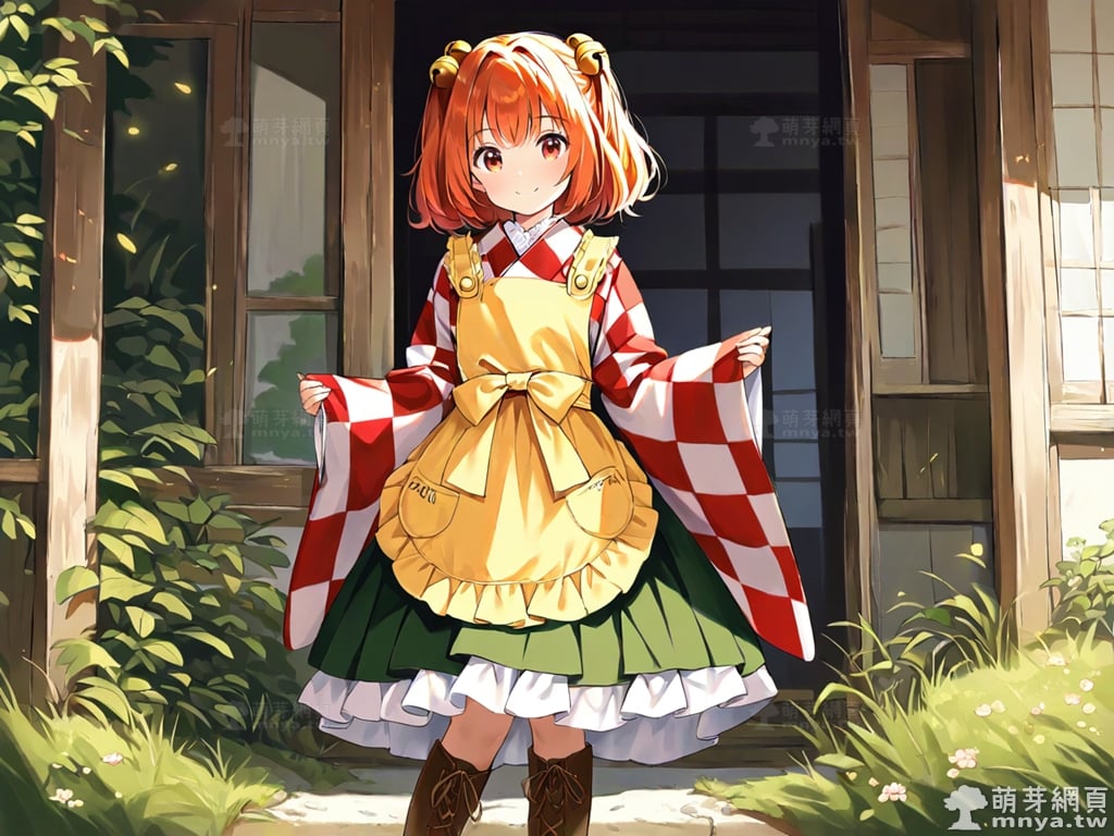 提詞文字:(masterpiece), (high quality), (high score), (great score), (year 2020), (kawaii), (loli), (photorealistic:0.1), 1girl, solo, (motoori kosuzu), touhou, __posture__, short hair, orange hair, hair bell, hair ornament, red eyes, apron, bell, boots, brown boots, heckered clothes, dress, green dress, japanese clothes, long sleeves, yellow apron, medium breasts, breasts, cowboy shot, __looking__, __expression__, __background__.