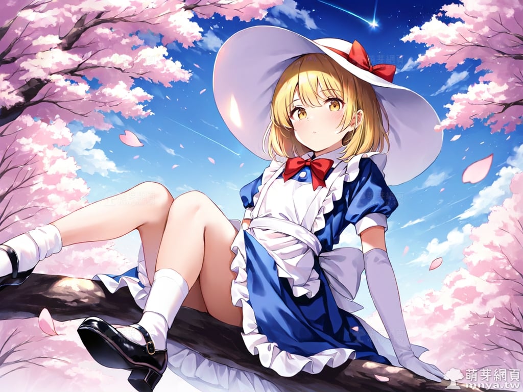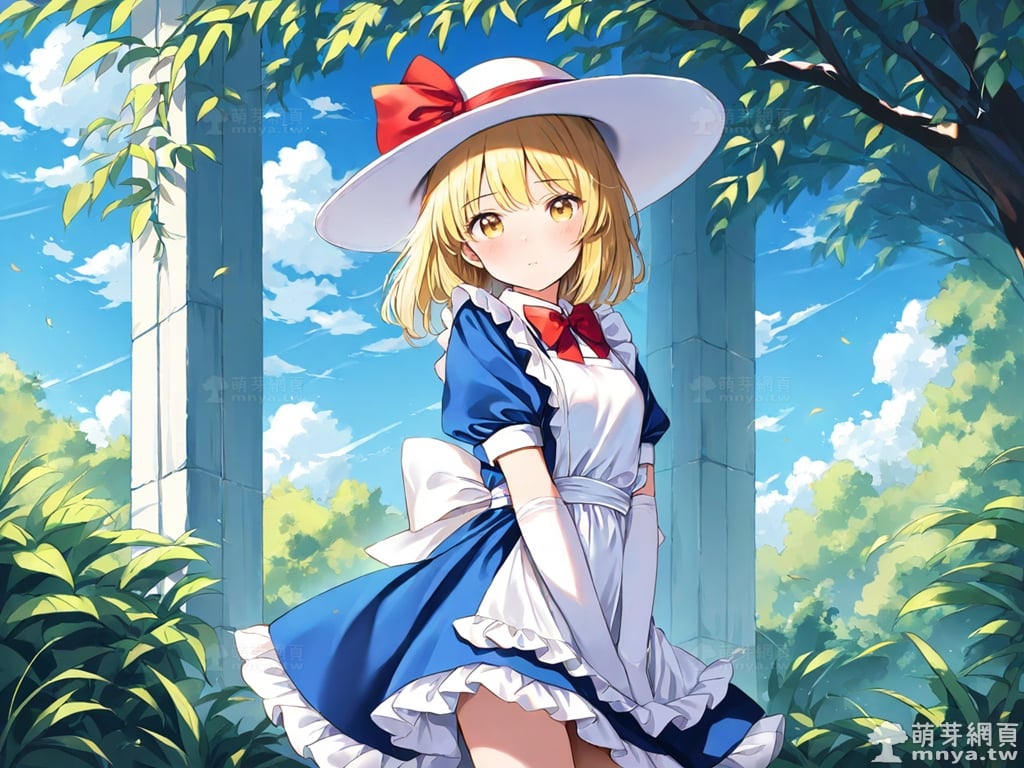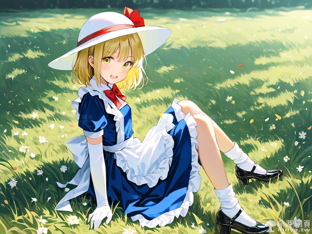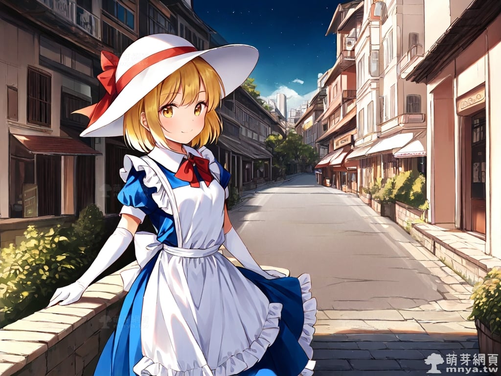 提詞文字:(masterpiece), (high quality), (high score), (great score), (year 2020), (kawaii), (loli), (photorealistic:0.1), 1girl, solo, (kana anaberal), touhou, touhou \(pc-98\), __posture__, short hair, blonde hair, yellow eyes, apron, back bow, black shoes, blue dress, bow, bowtie, dress, elbow gloves, frilled apron, frilled dress, frills, gloves, hat, hat ribbon, high heels, mary janes, puffy short sleeves, puffy sleeves, red bow, red bowtie, red ribbon, ribbon, shoes, short sleeves, socks, sun hat, white apron, white bow, white gloves, white hat, white socks, medium breasts, breasts, cowboy shot, __looking__, __expression__, __background__.