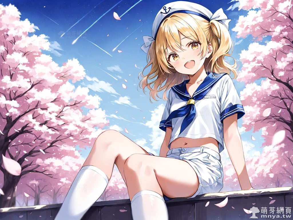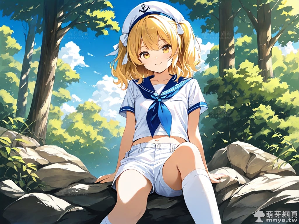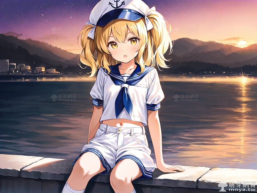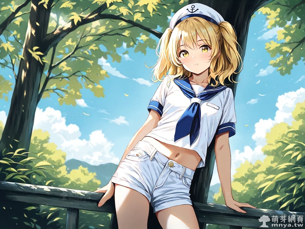 提詞文字:(masterpiece), (high quality), (high score), (great score), (year 2020), (kawaii), (loli), (photorealistic:0.1), 1girl, solo, (kitashirakawa chiyuri), touhou, __posture__, medium hair, blonde hair, two side up, yellow eyes, anchor print, anchor symbol, black shoes, blue neckerchief, blue sailor collar, collarbone, cropped shirt, hat, hat ribbon, kneehighs, midriff peek, navel, neckerchief, white hat, white ribbon, white serafuku, white shirt, white shorts, white socks, ribbon, sailor collar, sailor hat, school uniform, serafuku, shirt, shoes, short sleeves, shorts, socks, medium breasts, breasts, cowboy shot, __looking__, __expression__, __background__.