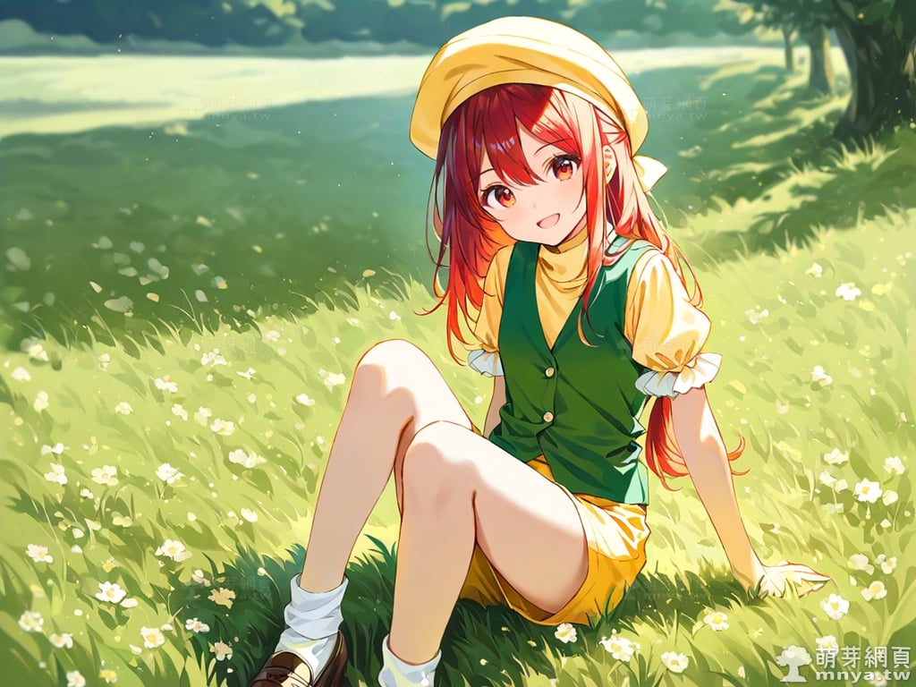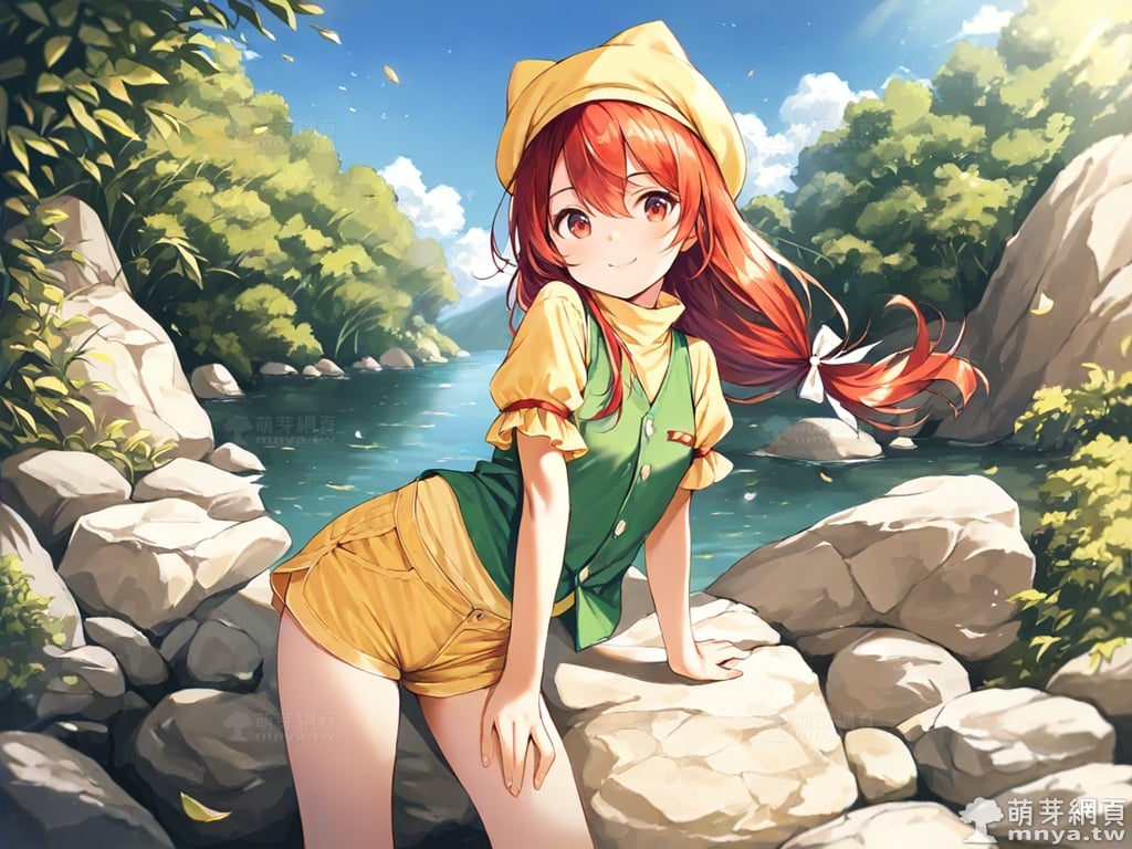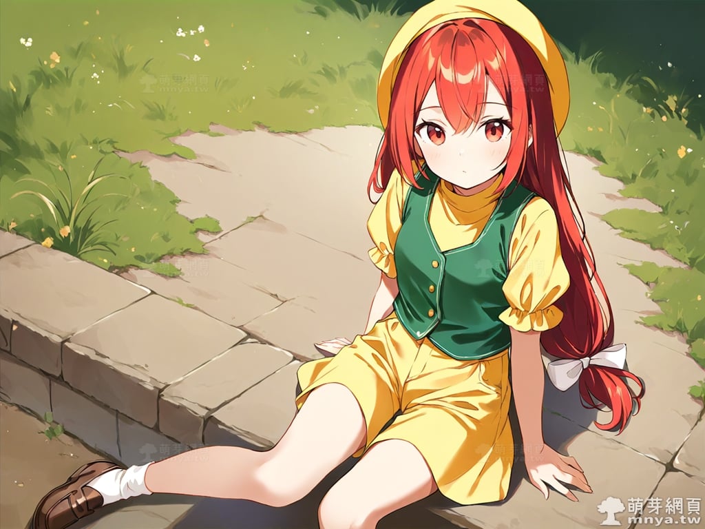 提詞文字:(masterpiece), (high quality), (high score), (great score), (year 2020), (kawaii), (loli), (photorealistic:0.1), 1girl, solo, (orange \(touhou\)), touhou, __posture__, long hair, low-tied long hair, red hair, ribbon, hair ribbon, yellow ribbon, hair between eyes, red eyes, yellow hat, hat, white bow, bow, buttons, frilled sleeves, frills, , loafers, puffy short sleeves, puffy sleeves, shirt, shoes, short sleeves, shorts, socks, turtleneck, undershirt, white shoes, white socks, yellow shirt, yellow shorts, green vest, vest, medium breasts, breasts, cowboy shot, __looking__, __expression__, __background__.