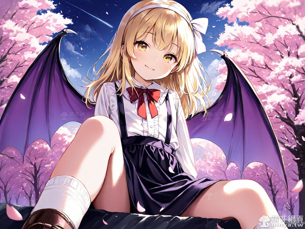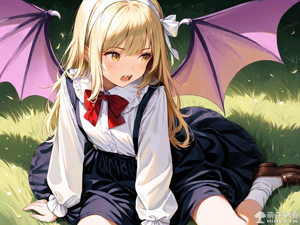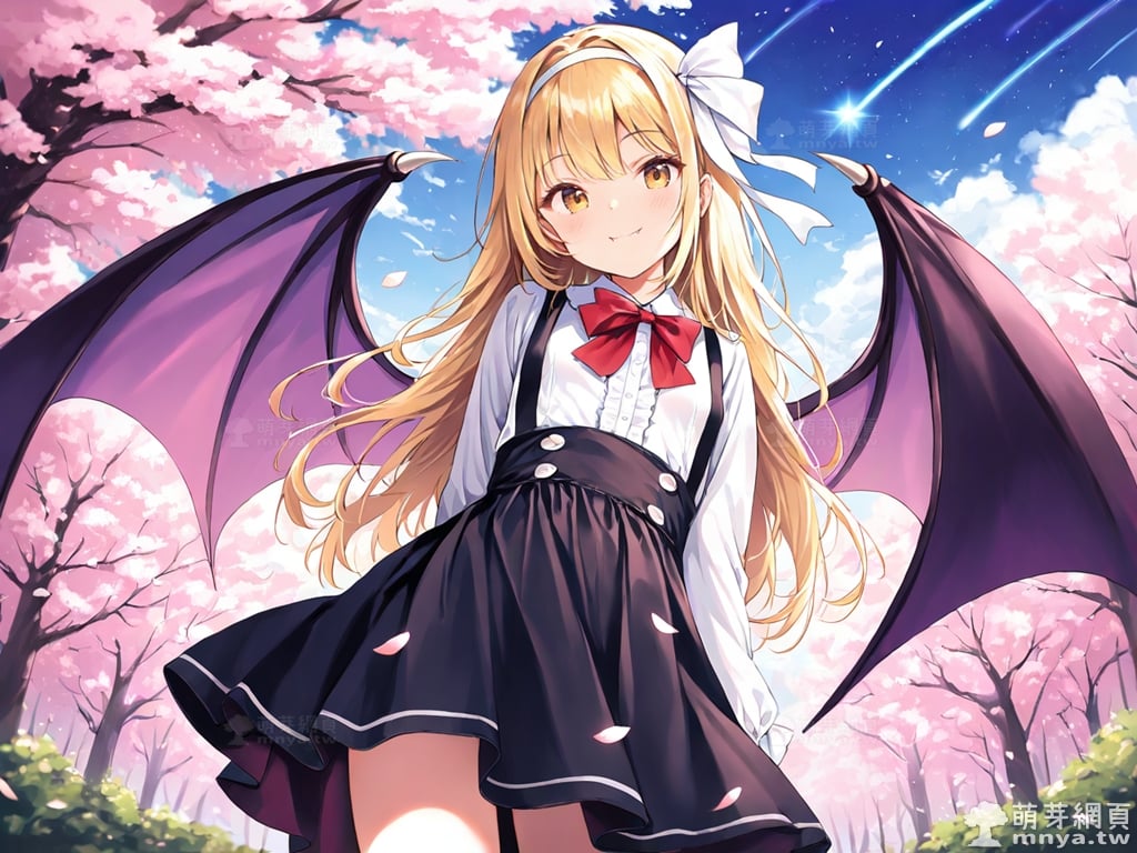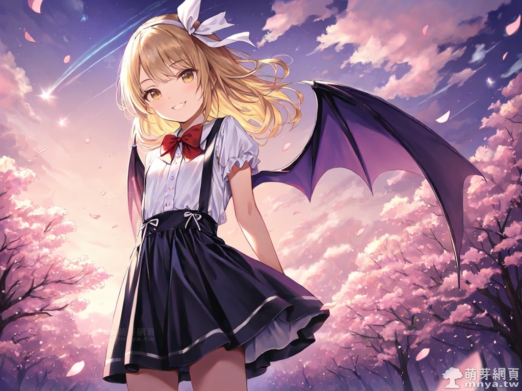 東方Project角色 AI 圖畫第兩百一十四彈,此次的目標是「東方幻想鄉~ Lotus Land Story.」初次登場的「胡桃」(くるみ,Kurumi),是一位有著巨大紫色蝙蝠翅膀的吸血鬼少女,她同時也是博麗神社後山某個湖泊的守衛。胡桃有著一頭亮麗的金色長髮,並以白色蝴蝶結髮帶點綴,搭配一雙與髮色相互輝映的金色眼瞳,整體造型給人一種可愛又充滿活力的感覺。儘管身為強大的吸血鬼種族,她的實力卻不算太高,甚至被愛說大話的魔理沙戲稱為「小鳥」。胡桃很認真負責地守衛著夢幻館的入口,但兩次阻止前來調查異變的主角時都以失敗收場。使用 SDXL 模型直接生成,效果很不錯。總共產生 100 張,挑掉不合理跟瑕疵較多的有 7 張如下提供大家參考。