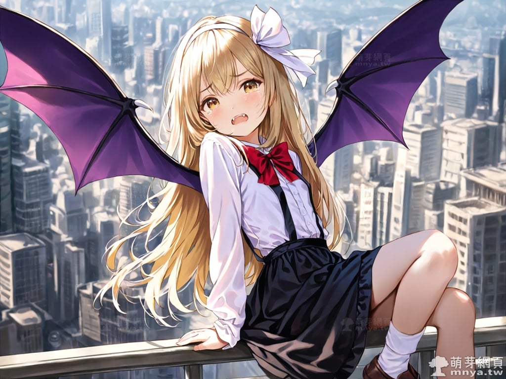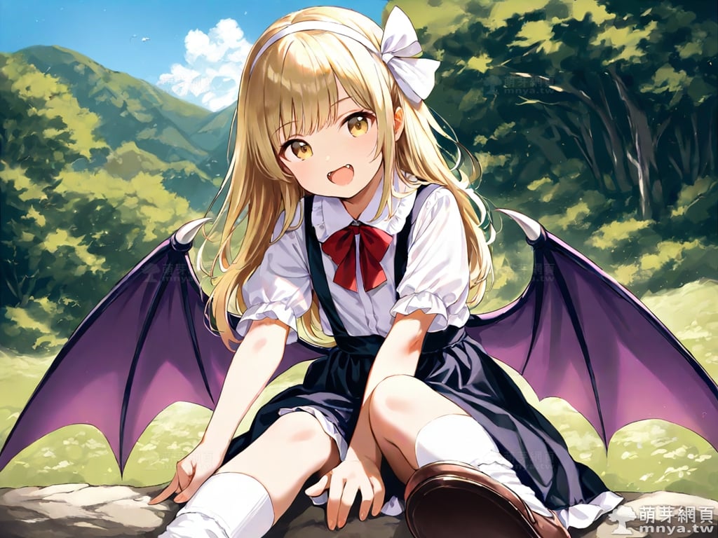 提詞文字:(masterpiece), (high quality), (high score), (great score), (year 2020), (kawaii), (loli), (photorealistic:0.1), 1girl, solo, (kurumi \(touhou\)), touhou, __posture__, long hair, blonde hair, hair ribbon, white ribbon, ribbon, hairband, yellow eyes, vampire, red bowtie, bowtie, red bow, bow, bat wings, black skirt, brown shoes, fangs, shirt, shoes, skirt, socks, white ribbon, white shirt, white socks, purple wings, wings, suspender skirt, suspenders, small breasts, breasts, cowboy shot, __looking__, __expression__, __background__.