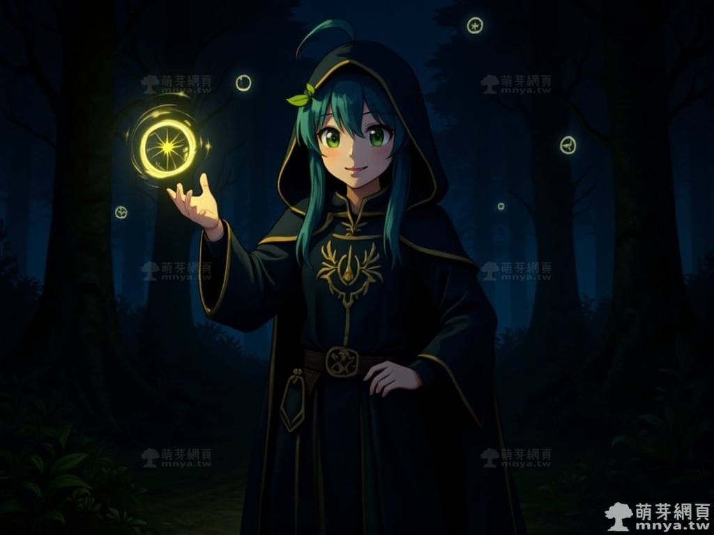 她化身為神秘法師,舉起手喚出光輝的魔法陣,暮色森林中閃爍的光點回應著她的咒語。
