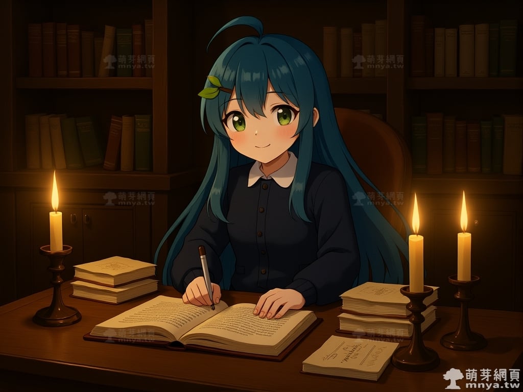 她化身為學者,靜坐於古老的書桌前,燭火映照書頁,知識的微光彷彿在書寫歷史的永恆。