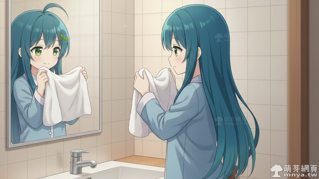 ▲ 清晨的例行公事少不了洗臉與整理儀容。萌芽娘拿起柔軟的毛巾,映著鏡中的自己,露出一抹清新的微笑,準備迎接美好的一天。