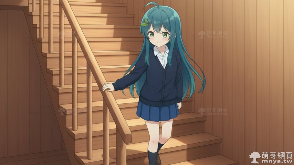 ▲ 她輕快地踏下木製樓梯,晨光在身後灑落。萌芽娘的步伐充滿活力,也將整個家映照出溫暖的氛圍。