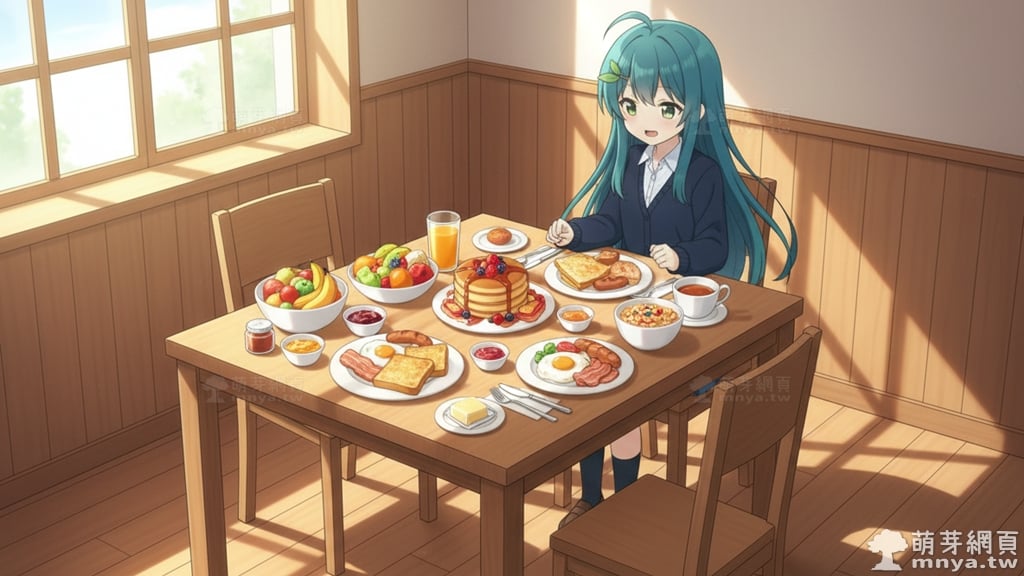 ▲ 早餐時間是一天中最幸福的時刻。豐盛的餐桌上擺滿吐司、培根、水果與熱飲,萌芽娘滿心期待地享用這份早晨的儀式感。