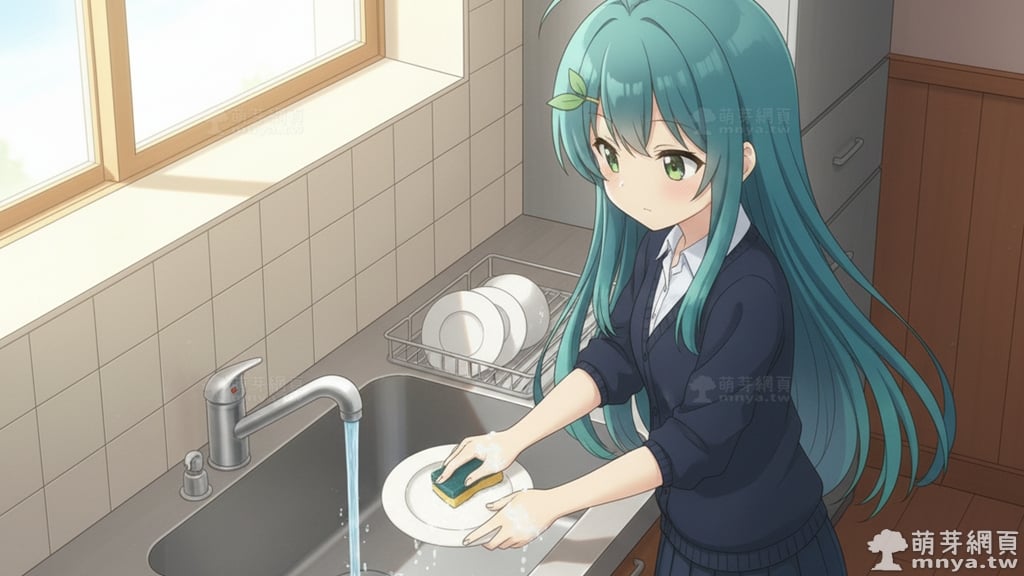 ▲ 在水槽旁,萌芽娘專心地洗著碗盤。清水的聲音搭配晨光的灑落,構成了生活中最溫柔的片刻。