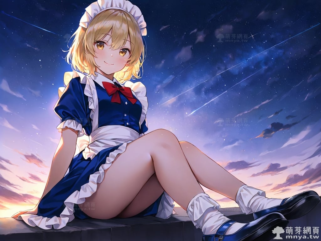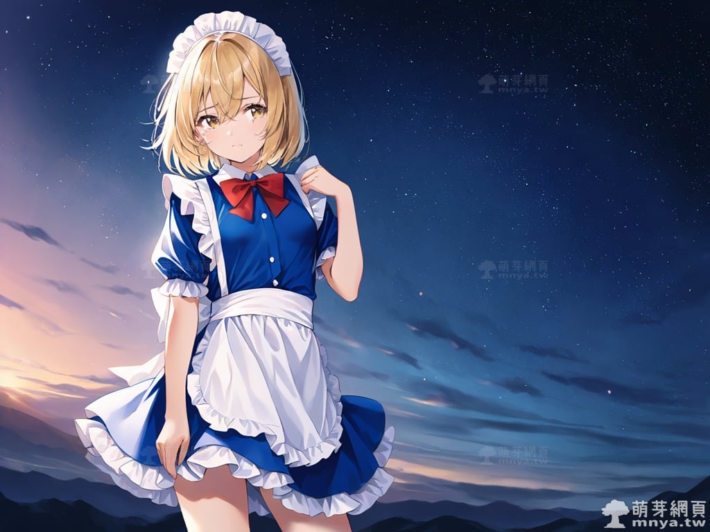 提詞文字:(masterpiece), (high quality), (high score), (great score), (year 2020), (kawaii), (loli), (photorealistic:0.1), 1girl, solo, (mugetsu \(touhou\)), touhou, __posture__, short hair, blonde hair, hair between eyes, yellow eyes, apron, blue dress, blue shoes, bobby socks, bow, bowtie, dress, frilled dress, frilled sleeves, frills, maid, maid apron, maid headdress, mary janes, puffy short sleeves, puffy sleeves, red bow, red bowtie, shoes, short sleeves, socks, waist apron, white apron, white socks, medium breasts, breasts, cowboy shot, __looking__, __expression__, __background__.