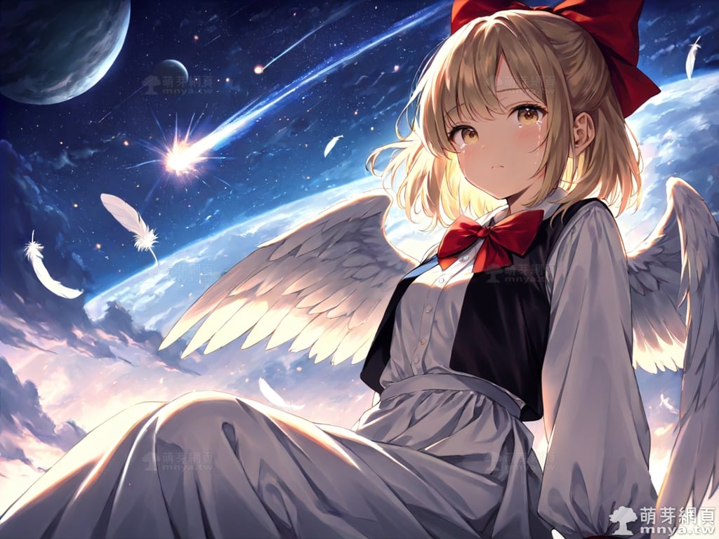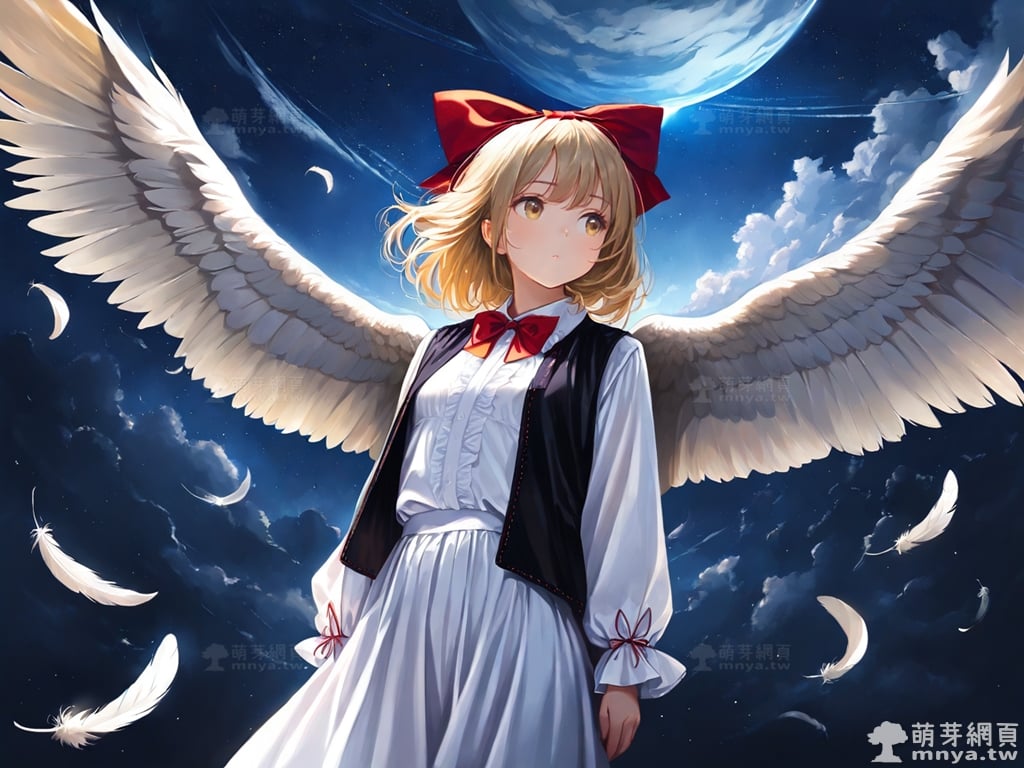 東方Project角色 AI 圖畫第兩百一十八彈,此次的目標是「東方幻想鄉~ Lotus Land Story.」初次登場的「幻月」(幻月,Gengetu),夢月的雙胞胎姐姐,也是無名夢境世界的另一位主人,且實力比妹妹更強。她的種族是惡魔,活動範圍在無名夢境世界,出身地區也在此。在外型上,幻月是一位看上去像長有天使之翼的少女,擁有一頭金色的短髮,一雙璀璨的金瞳。她的主要特徵包含一對巨大的白色翅膀、頭上束著一個醒目的大紅色蝴蝶結、穿著一件深色背心搭配白襯衫,並繫著一個紅色領結。在遊戲劇情中,她因為看不慣自機和妹妹丟人的行為而現身與自機對峙,最終卻被莫名其妙地打敗並放跑了自機。使用 SDXL 模型直接生成,效果很不錯。總共產生 100 張,挑掉不合理跟瑕疵較多的有 8 張如下提供大家參考。
