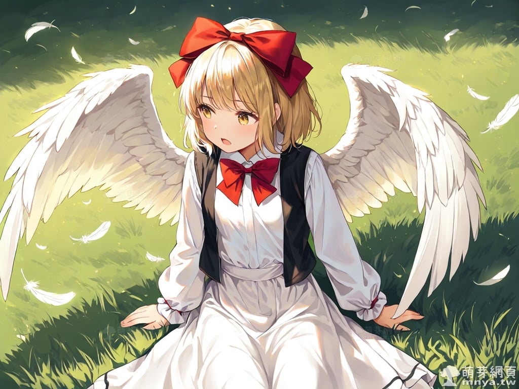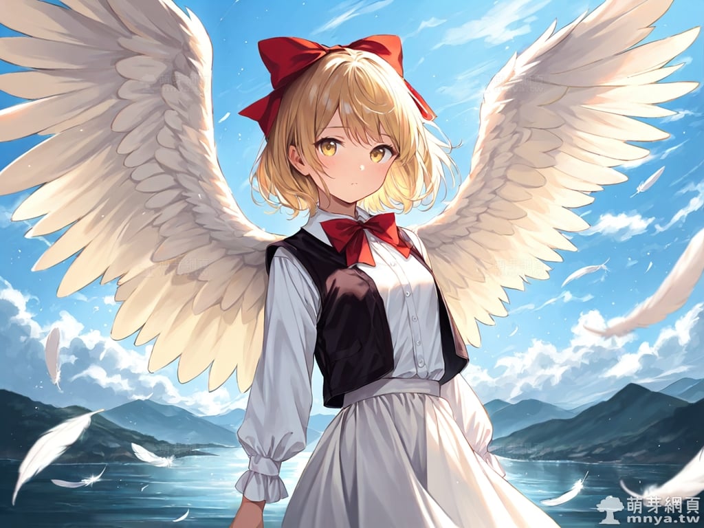 提詞文字:(masterpiece), (high quality), (high score), (great score), (year 2020), (kawaii), (loli), (photorealistic:0.1), 1girl, solo, (gengetsu \(touhou\)), touhou, __posture__, short hair, blonde hair, hair bow, red bow, bow, yellow eyes, bowtie, red bowtie, feathered wings, feathers, long skirt, long sleeves, open clothes, open vest, puffy long sleeves, puffy sleeves, shirt, skirt, skirt set, black vest, vest, white shirt, white skirt, white wings, wings, medium breasts, breasts, cowboy shot, __looking__, __expression__, __background__.