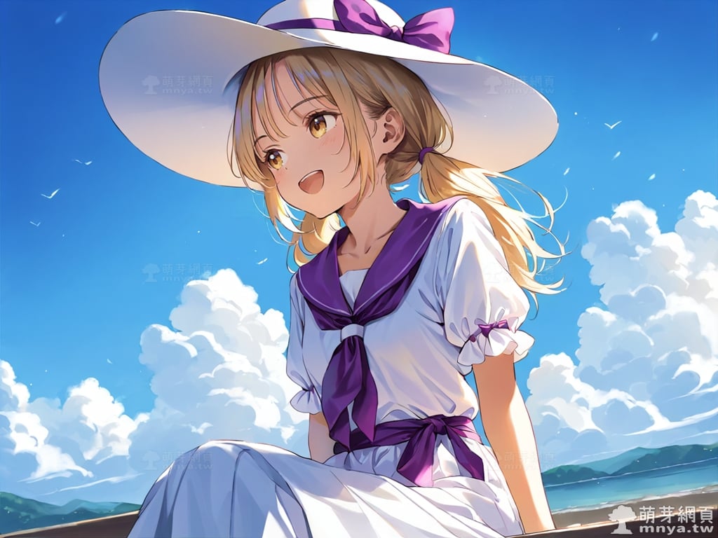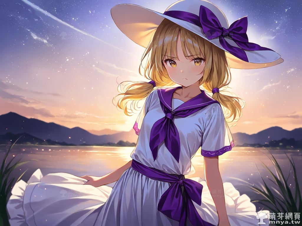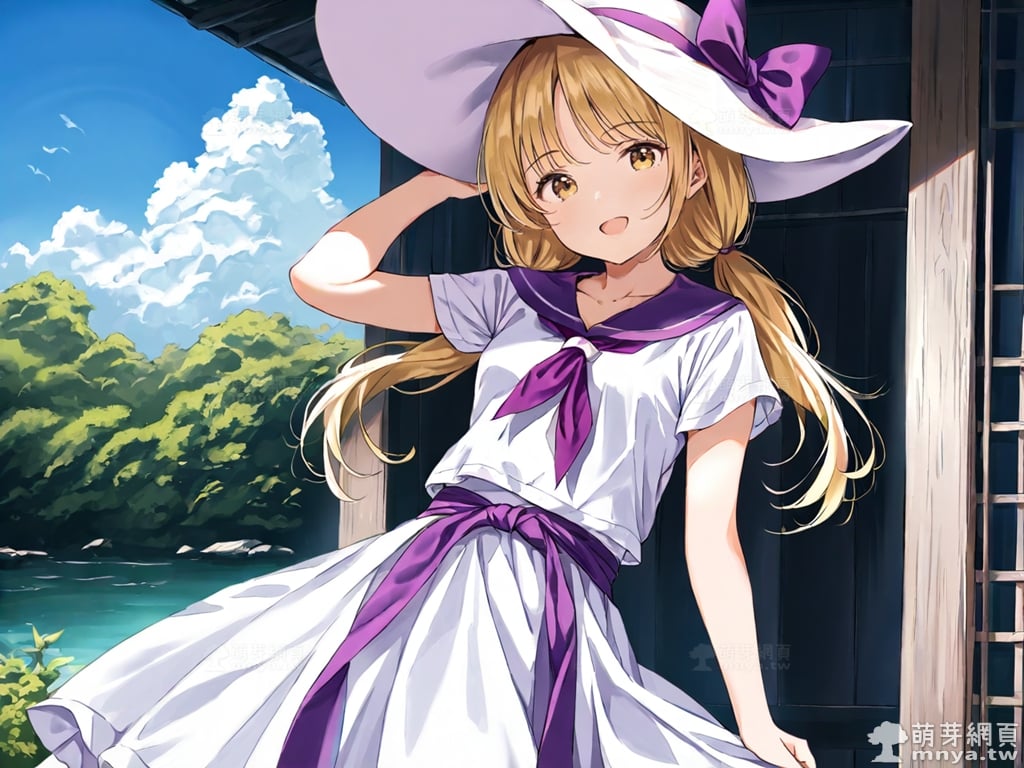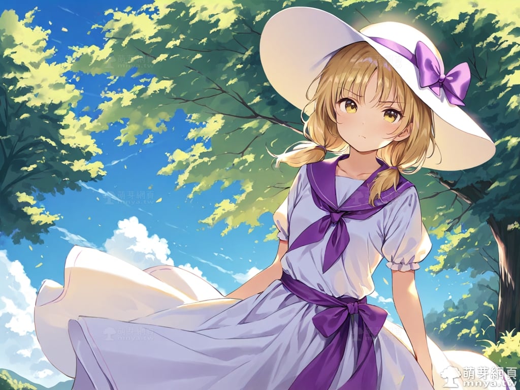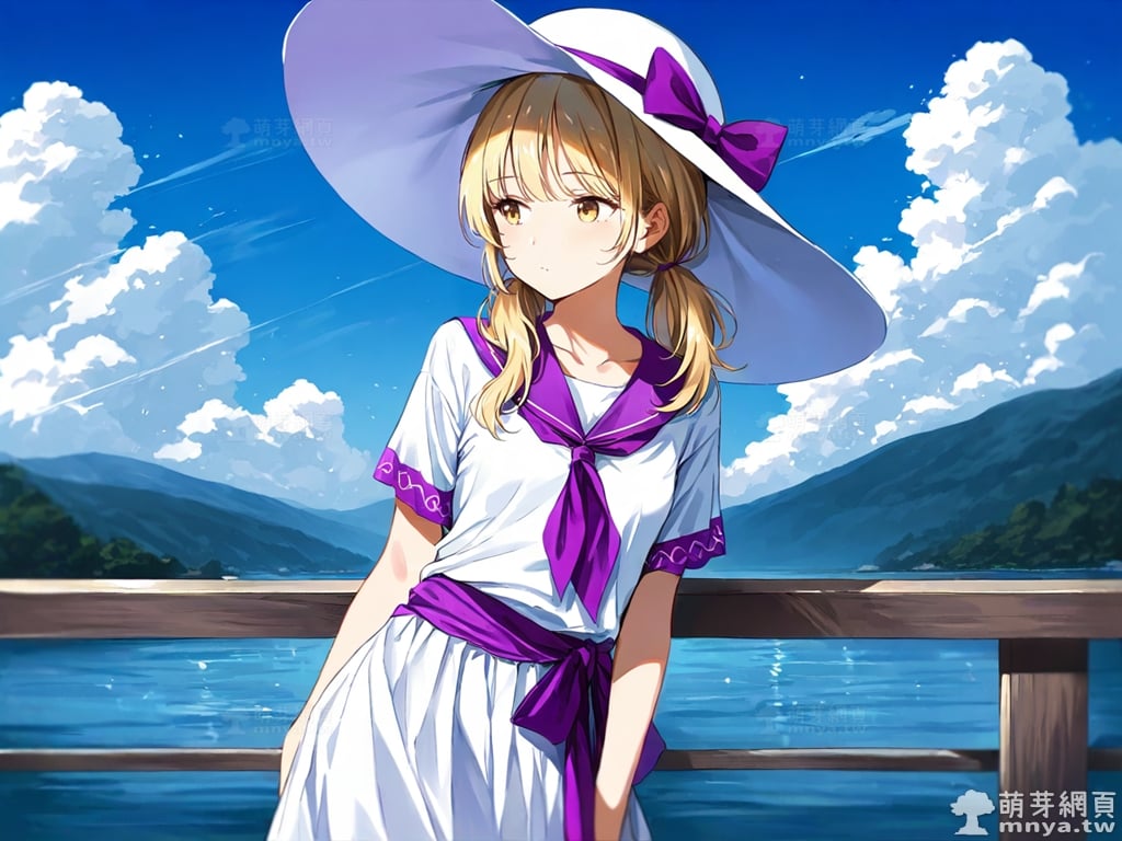 提詞文字:(masterpiece), (high quality), (high score), (great score), (year 2020), (kawaii), (loli), (photorealistic:0.1), 1girl, solo, (louise \(touhou\)), touhou, __posture__, long hair, blonde hair, low twintails, twintails, choppy bangs, sun hat, hat, hat bow, purple bow, bow, white hat, yellow eyes, collarbone, long skirt, neckerchief, white shirt, white skirt, purple neckerchief, purple sash, purple sailor collar, shirt, short sleeves, skirt, medium breasts, breasts, cowboy shot, __looking__, __expression__, __background__.