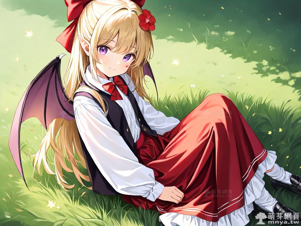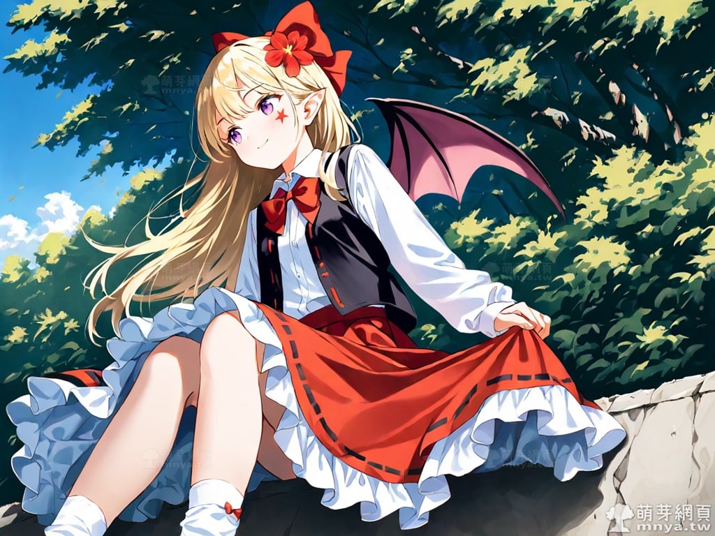 提詞文字:(masterpiece), (high quality), (high score), (great score), (year 2020), (kawaii), (loli), (photorealistic:0.1), 1girl, solo, (elis \(touhou\)), touhou, __posture__, long hair, blonde hair, hair bow, red bow, bow, hair flower, red flower, hair ornament, purple eyes, bat wings, black shoes, black vest, bowtie, red bowtie, collared shirt, facial mark, frilled skirt, frills, loafers, long skirt, long sleeves, mark under eye, open clothes, open vest, pointy ears, puffy long sleeves, puffy sleeves, red skirt, shirt, shoes, skirt, socks, star \(symbol\), vest, white shirt, white socks, wings, small breasts, breasts, cowboy shot, __looking__, __expression__, __background__.