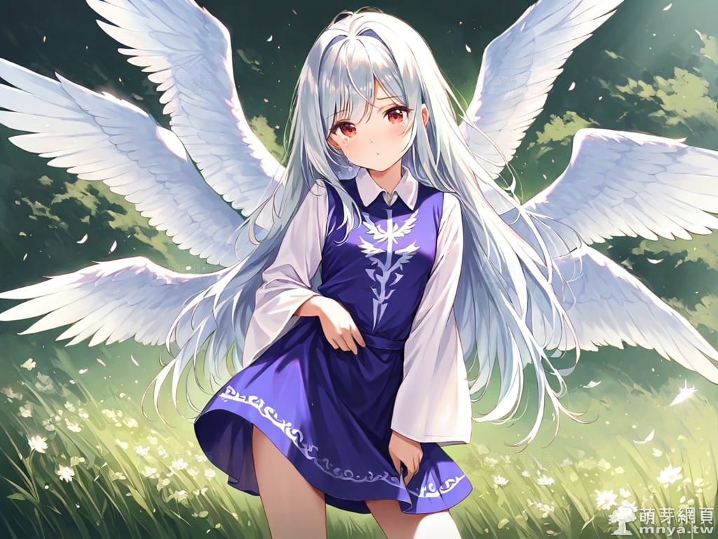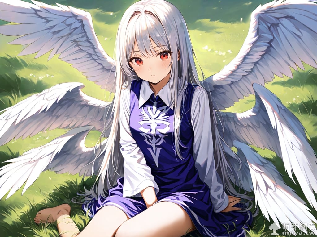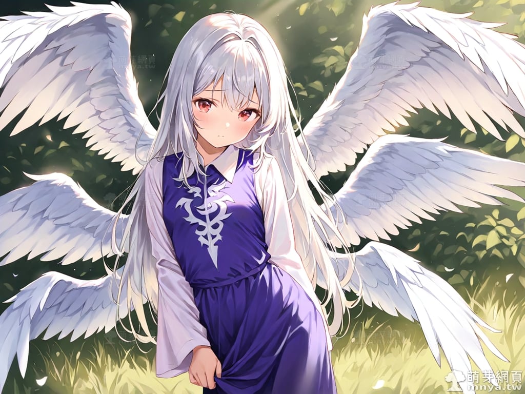 提詞文字:(masterpiece), (high quality), (high score), (great score), (year 2020), (kawaii), (loli), (photorealistic:0.1), 1girl, solo, (sariel \(touhou\)), touhou, __posture__, long hair, very long hair, white hair, hair intakes, red eyes, angel, angel wings, collared shirt, pinafore dress, dress, feathered wings, long sleeves, purple dress, shirt, white wings, wide sleeves, multiple wings, wings, barefoot, medium breasts, breasts, cowboy shot, __looking__, __expression__, __background__.