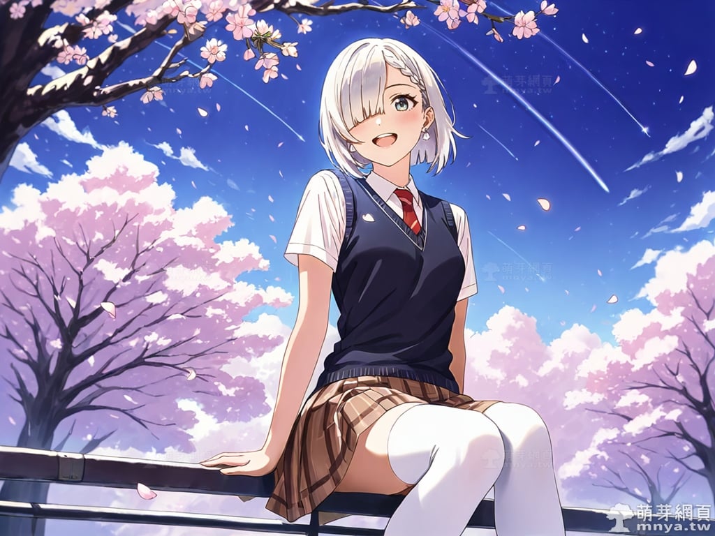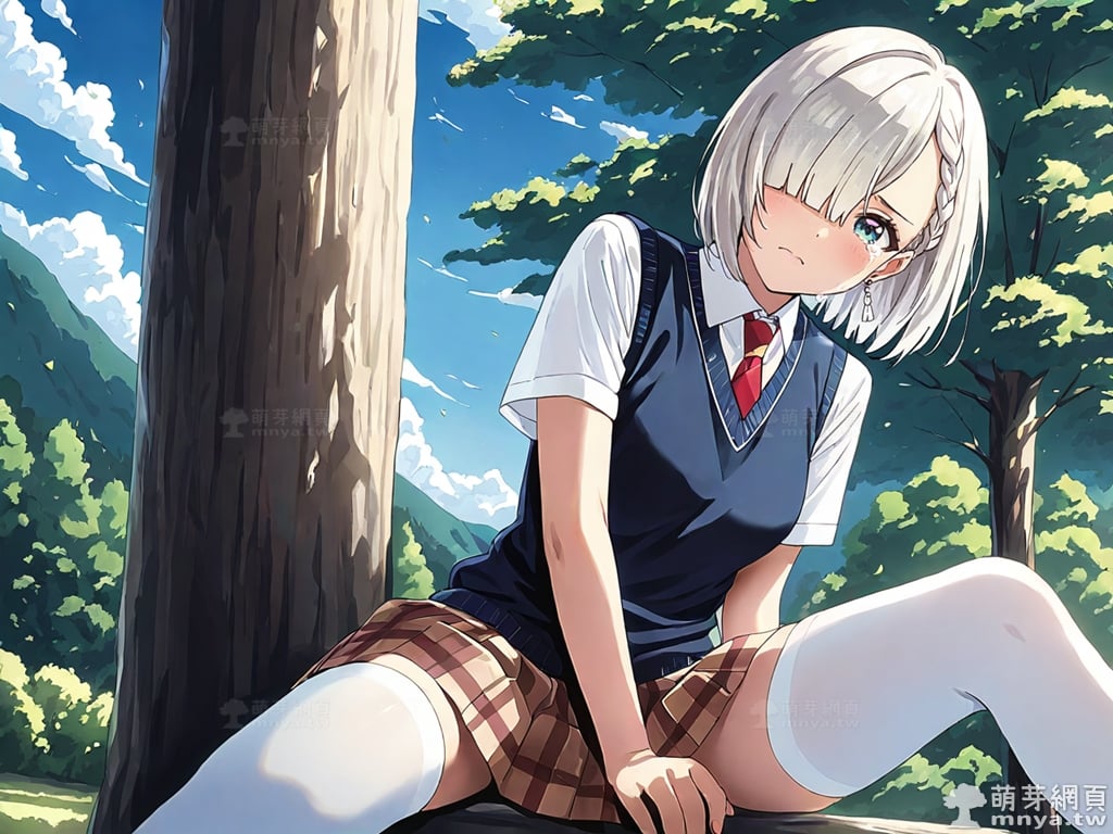 提詞文字:(masterpiece), (high quality), (high score), (great score), (year 2020), (kawaii), (loli), (photorealistic:0.1), 1girl, solo, (tsukinomori mashiro:1.2), __posture__, short hair, white hair, braid, hair over one eye, bangs, blue eyes, skirt, white thighhighs, thighhighs, necktie, red necktie, shirt, school uniform, white shirt, sweater vest, vest, short sleeves, pleated skirt, earrings, collared shirt, jewelry, brown skirt, zettai ryouiki, large breasts, breasts, cowboy shot, __looking__, __expression__, __background__. <lora:tsukinomori_mashiro_XL:1>