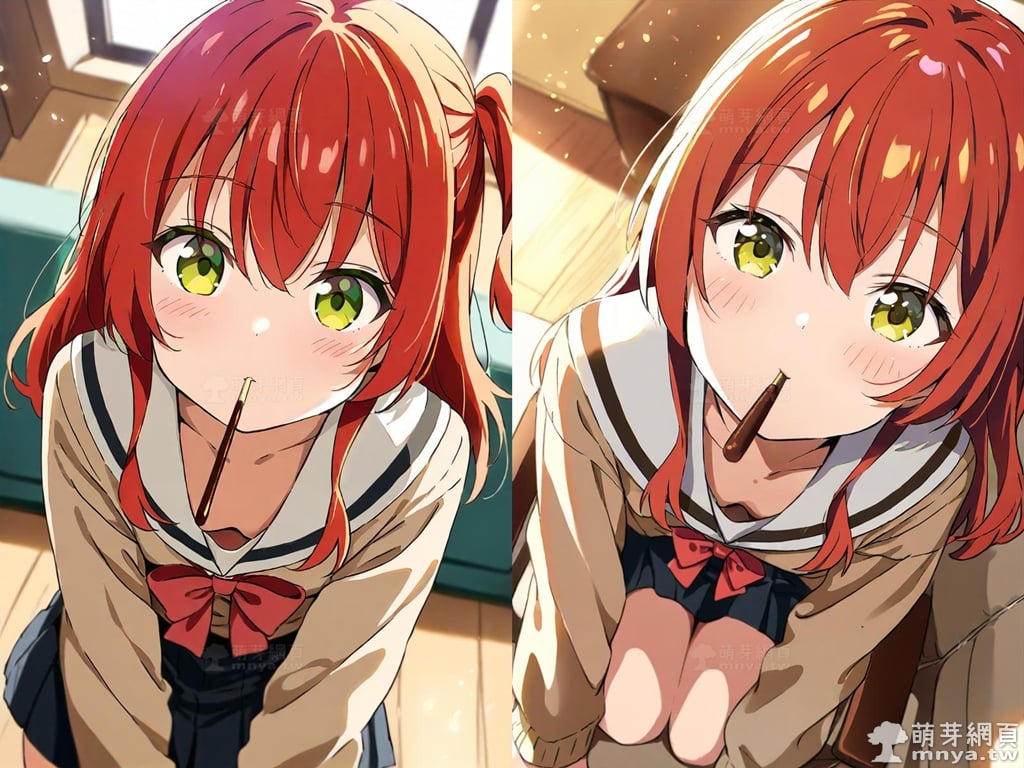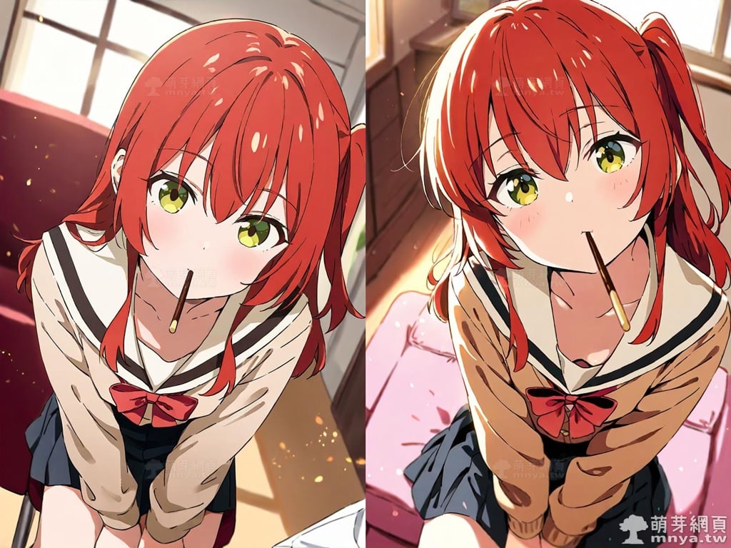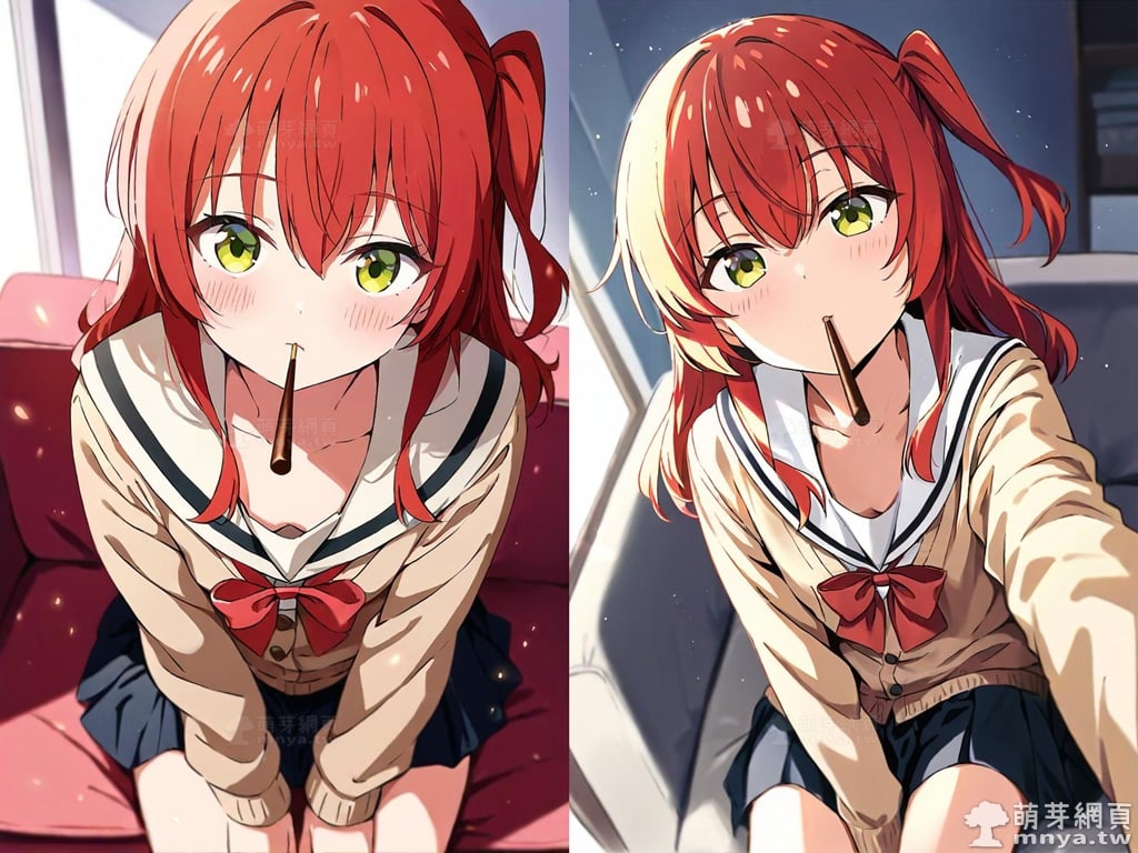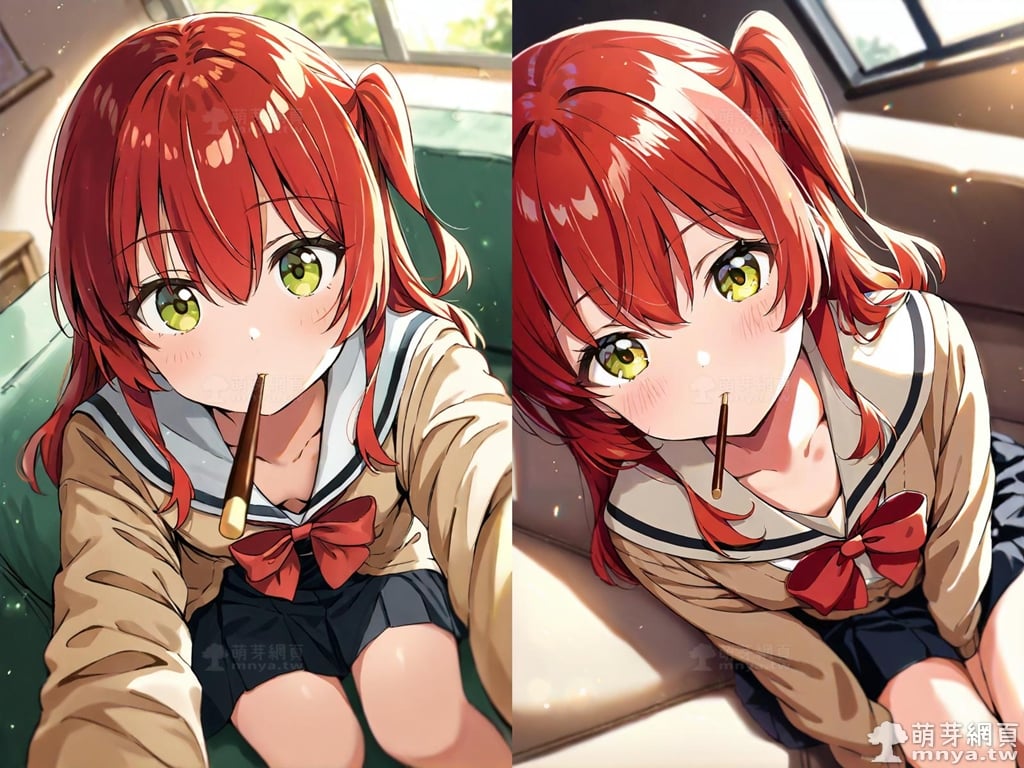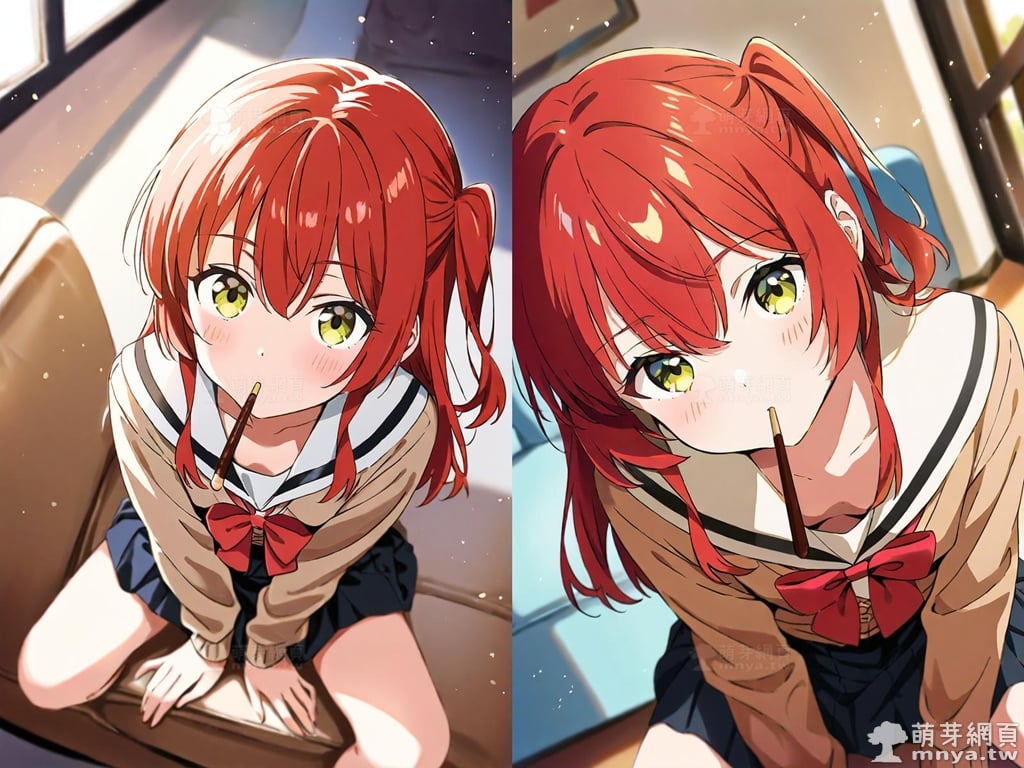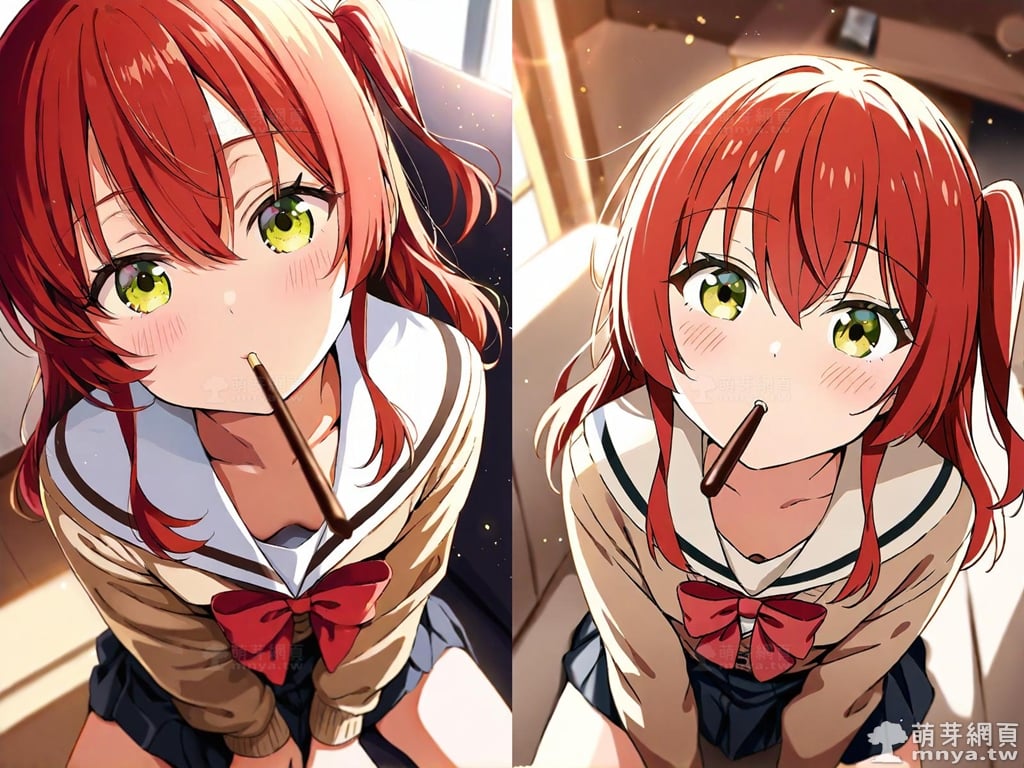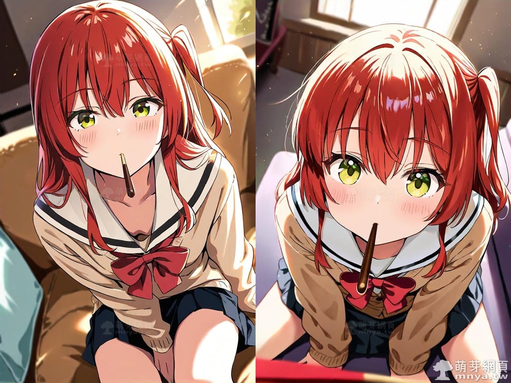 提詞文字:(masterpiece), (high quality), (high score), (great score), (year 2020), (kawaii), (loli), (photorealistic:0.1), (anime coloring), 1girl, solo, (kita ikuyo), bocchi the rock!, long hair, red hair, sidelocks, one side up, bangs, hair between eyes, green eyes, yellow eyes, red bowtie, bowtie, sailor collar, white sailor collar, pleated skirt, skirt, long sleeves, black skirt, shirt, brown cardigan, cardigan, white shirt, collared shirt, double-breasted, buttons, small breasts, breasts, looking at viewer, mouth hold, sitting, food in mouth, leaning forward, pocky kiss, arm support, all fours, holding food, feeding, closed mouth, looking up, downblouse, head tilt, holding, hand between legs, eating, food, pocky, blush, pocky day, shared food, incoming pocky kiss, chocolate, indoors, from above, day, blurry, dutch angle, blurry background, upper body, pov, couch, sunlight, chair, window, light particles, depth of field