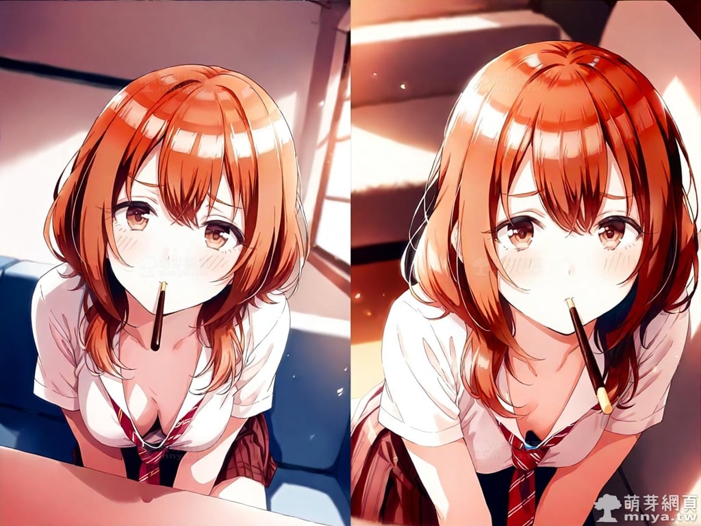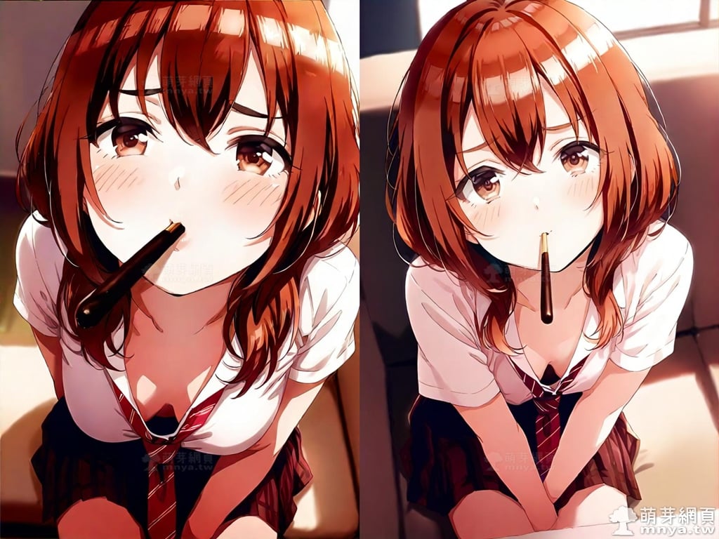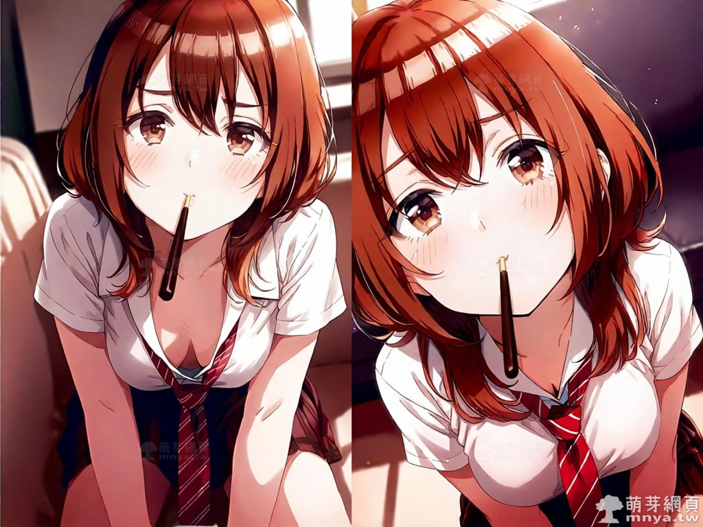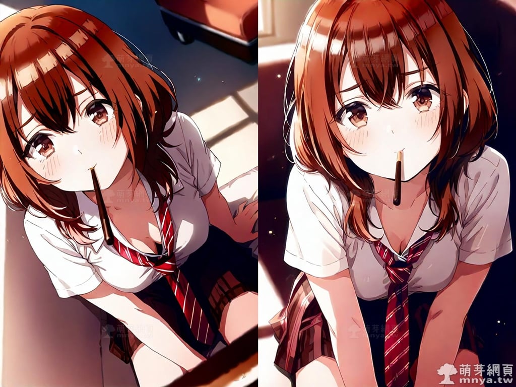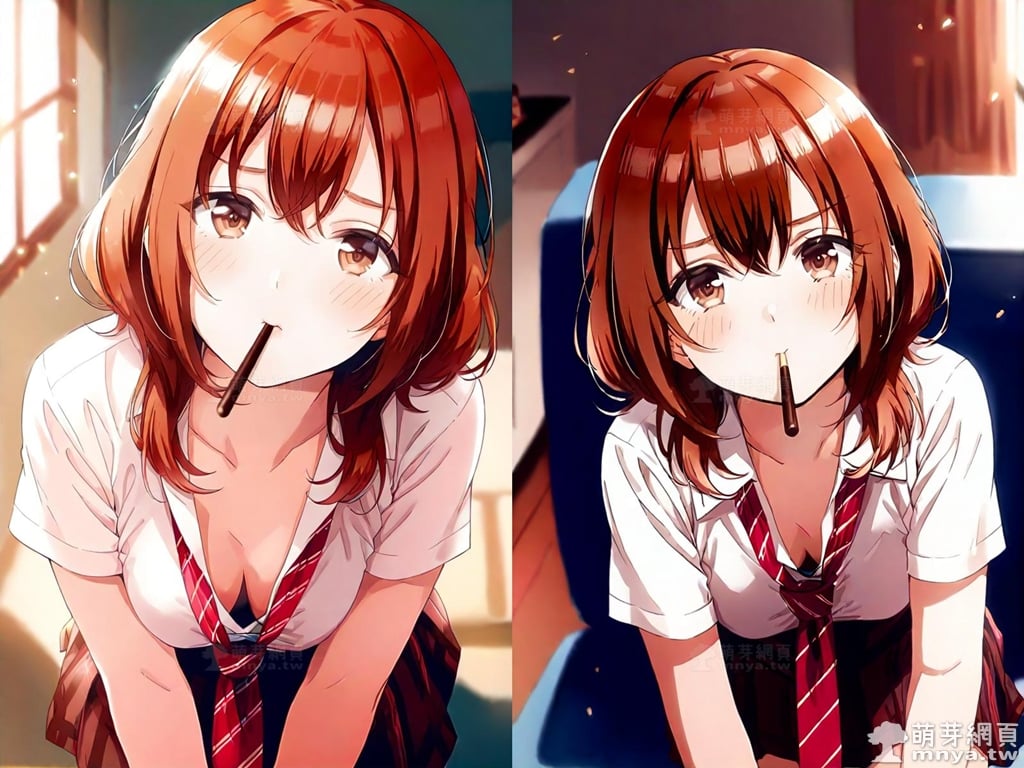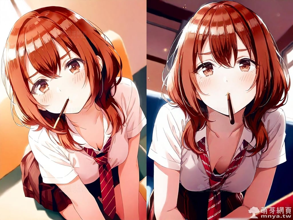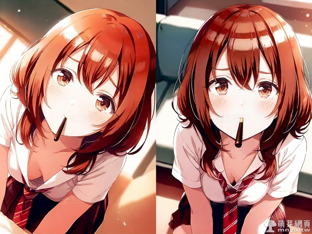 提詞文字:(masterpiece), (high quality), (high score), (great score), (year 2020), (kawaii), (loli), (photorealistic:0.1), (anime coloring), 1girl, solo, (kohinata iroha \(imouuzai\):1.5), medium hair, brown hair, orange hair, bangs, hair between eyes, brown eyes, red necktie, striped, striped necktie, necktie, white shirt, collared shirt, shirt, pleated skirt, brown skirt, skirt, short sleeves, large breasts, breasts, looking at viewer, mouth hold, sitting, food in mouth, leaning forward, pocky kiss, arm support, all fours, holding food, feeding, closed mouth, looking up, downblouse, head tilt, holding, hand between legs, eating, food, pocky, blush, pocky day, shared food, incoming pocky kiss, chocolate, indoors, from above, day, blurry, dutch angle, blurry background, upper body, pov, couch, sunlight, chair, window, light particles, depth of field <lora:kohinata_iroha_(imouuzai)_XL:1.15>