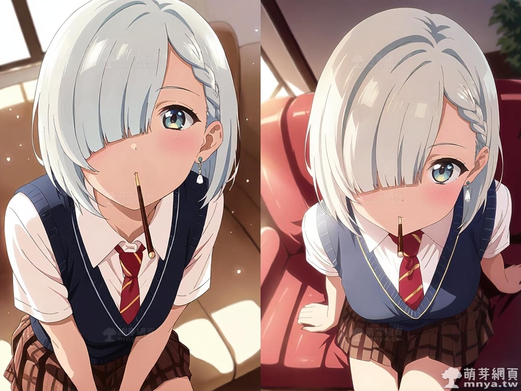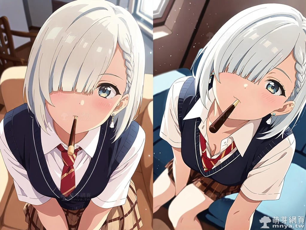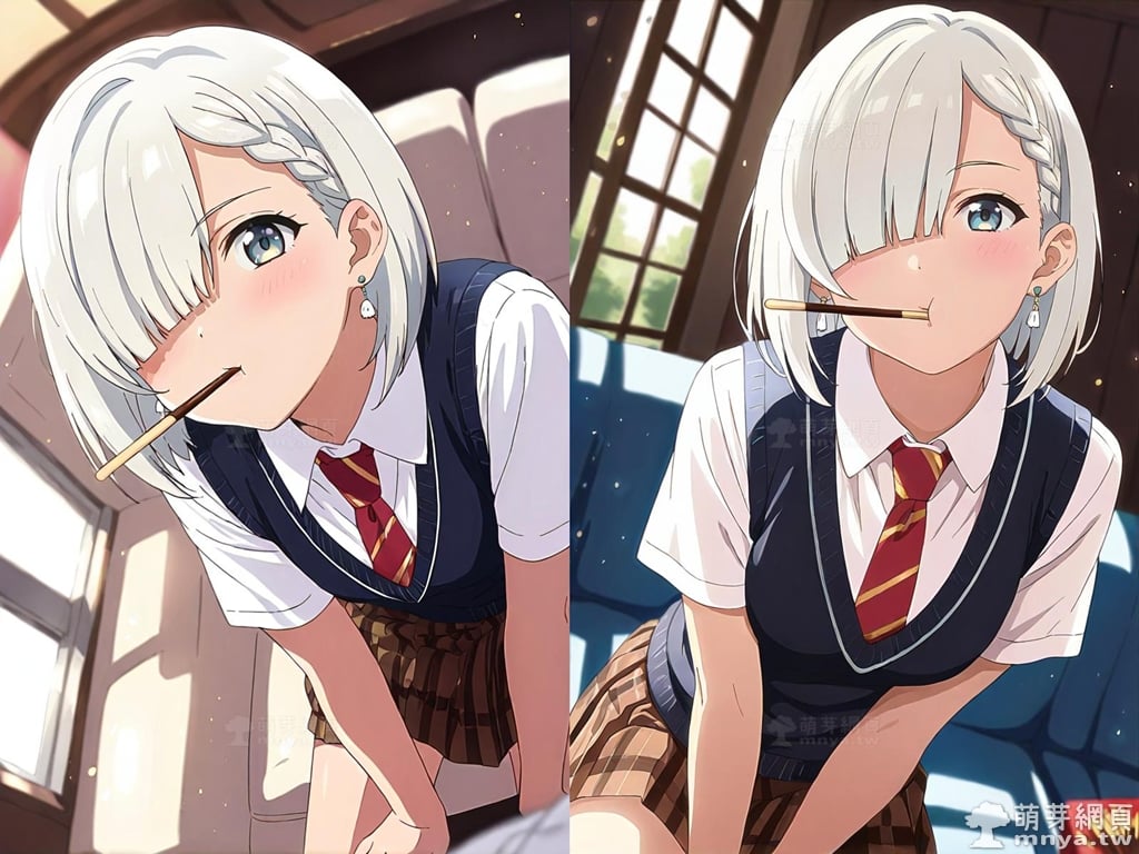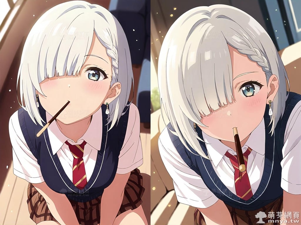 此次的目標是在「朋友的妹妹只纏著我」(友達の妹が俺にだけウザい,My Friend's Little Sister Has It In for Me!)[簡稱「妹纏」(いもウザ,ImoUza!)]登場的「月之森真白」(月ノ森 真白,Tsukinomori Mashiro),本作女主角之一,她是高中二年級生,也是明照的堂妹和青梅竹馬。在她的多重身份中,最引人注目的是她同時也是 UAZ 文庫超人氣新人職業小說家,筆名為「卷貝海參」,出道作是《白雪公主的復仇教室》。從外型上看,真白擁有一頭近乎白色的短髮,髮尾長度及肩,尤其引人注目的是她左側的髮絲被巧妙地編成一條細辮。她的右眼幾乎完全被遮蓋住,給人一種略帶內斂的神秘感,同時呼應了她起初膽小怕事的性格。她的瞳色呈現柔和的藍色,眼神溫柔而略帶羞澀。她通常穿著整齊的校服,深色的背心搭配白色襯衫和紅色領帶,下身是紅棕色格紋短裙。儘管她一開始面對明照時極度冷淡且言詞犀利,但這其實是她害羞和不知所措的表現,隨著故事發展,她在明照的幫助下逐漸打開心扉,正視自己對他的感情,並融入 5 樓同盟,同時與情敵彩羽維持著良好的友誼。這裡獻上正在玩 Pocky Game 含食俯身的真白。使用 SDXL 模型生成,並搭配自行訓練的 SDXL 專用 LoRA 模型,效果很不錯。總共產生 100 張,挑掉不合理跟瑕疵較多的有 18 張如下提供大家參考。