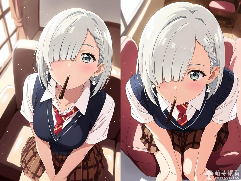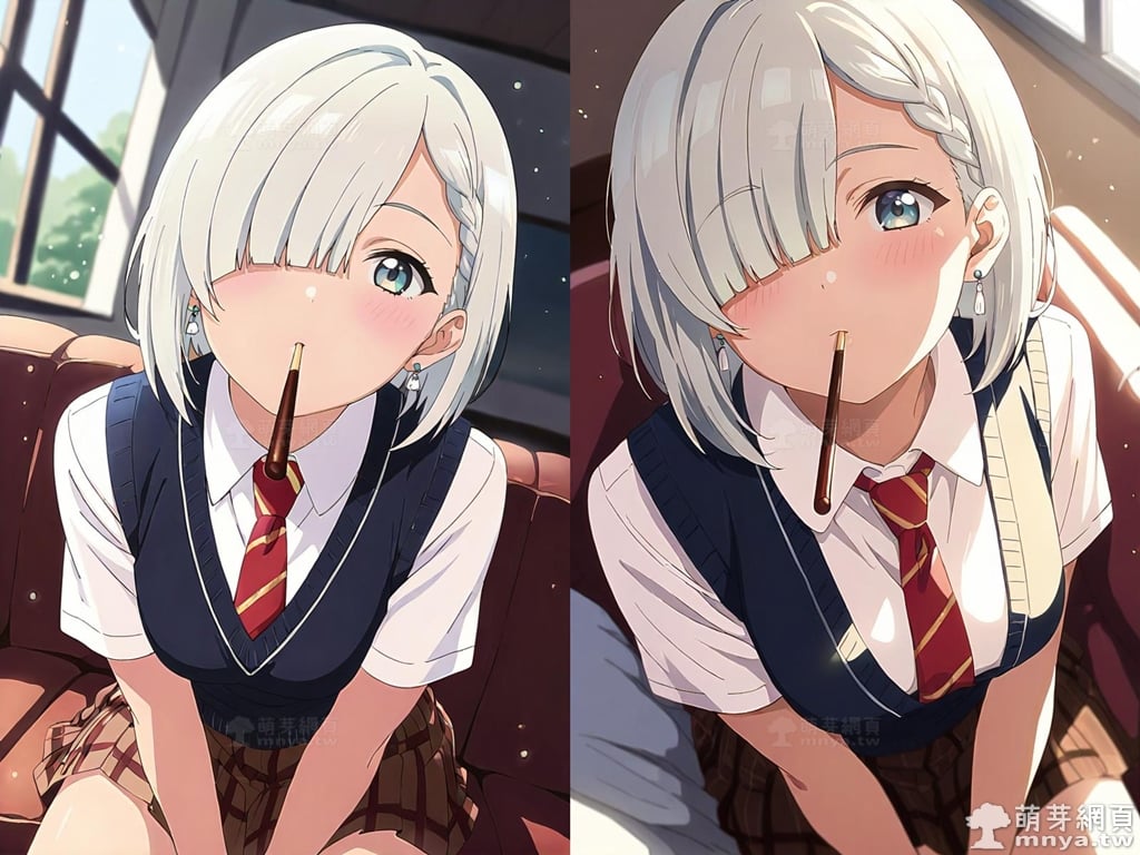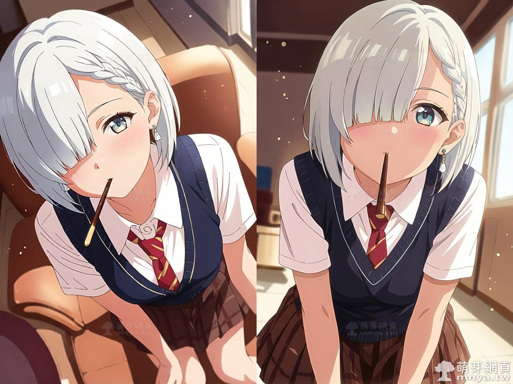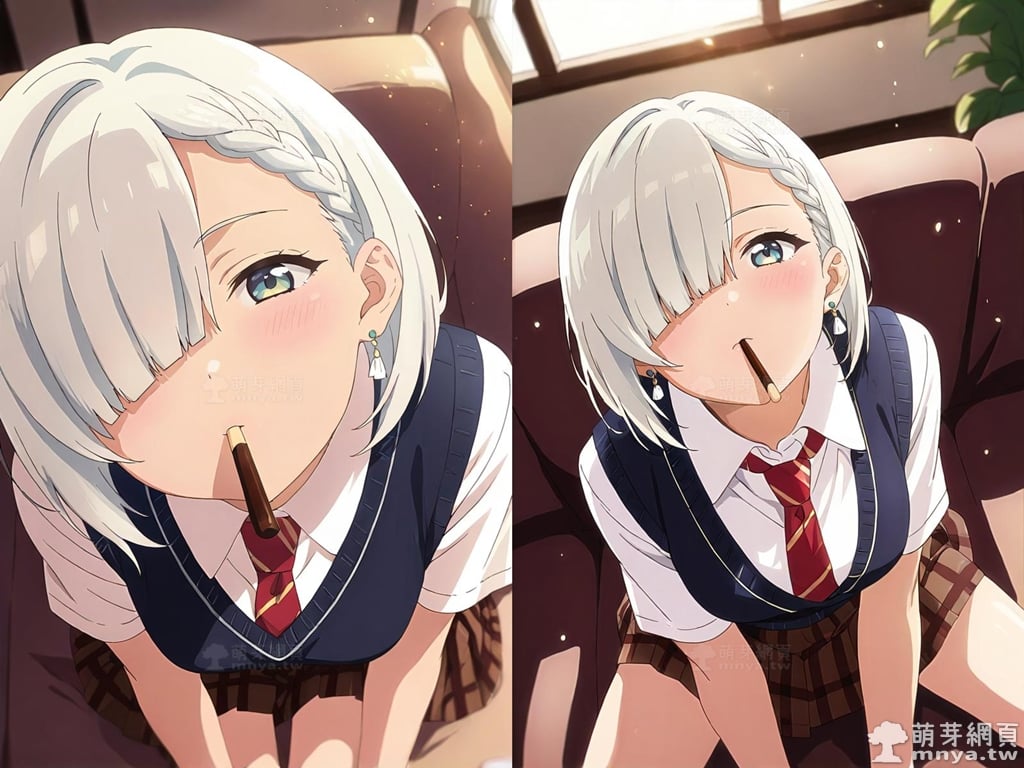 提詞文字:(masterpiece), (high quality), (high score), (great score), (year 2020), (kawaii), (loli), (photorealistic:0.1), (anime coloring), 1girl, solo, (tsukinomori mashiro:1.2), short hair, white hair, braid, hair over one eye, bangs, blue eyes, skirt, necktie, red necktie, shirt, white shirt, sweater vest, vest, short sleeves, pleated skirt, earrings, collared shirt, jewelry, brown skirt, large breasts, breasts, looking at viewer, mouth hold, sitting, food in mouth, leaning forward, pocky kiss, arm support, all fours, holding food, feeding, closed mouth, looking up, downblouse, head tilt, holding, hand between legs, eating, food, pocky, blush, pocky day, shared food, incoming pocky kiss, chocolate, indoors, from above, day, blurry, dutch angle, blurry background, upper body, pov, couch, sunlight, chair, window, light particles, depth of field <lora:tsukinomori_mashiro_XL:1>