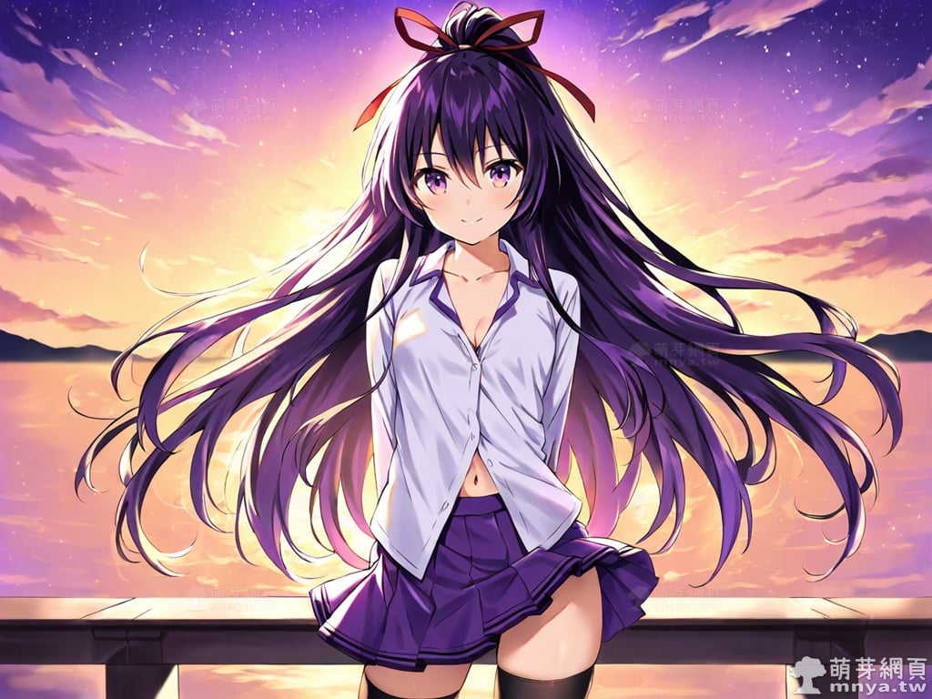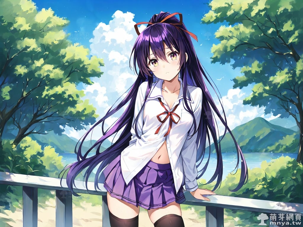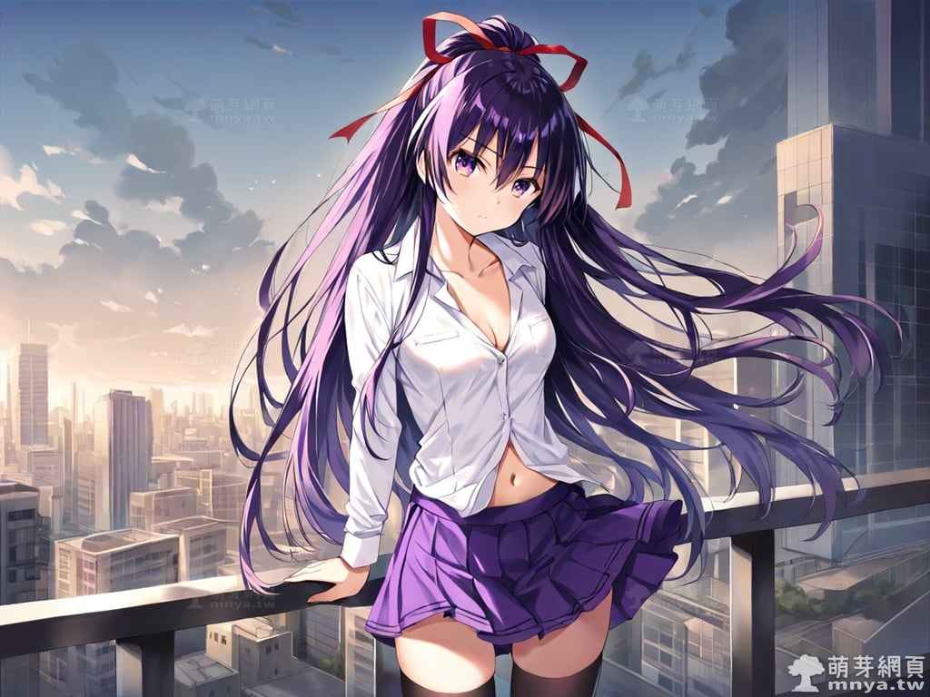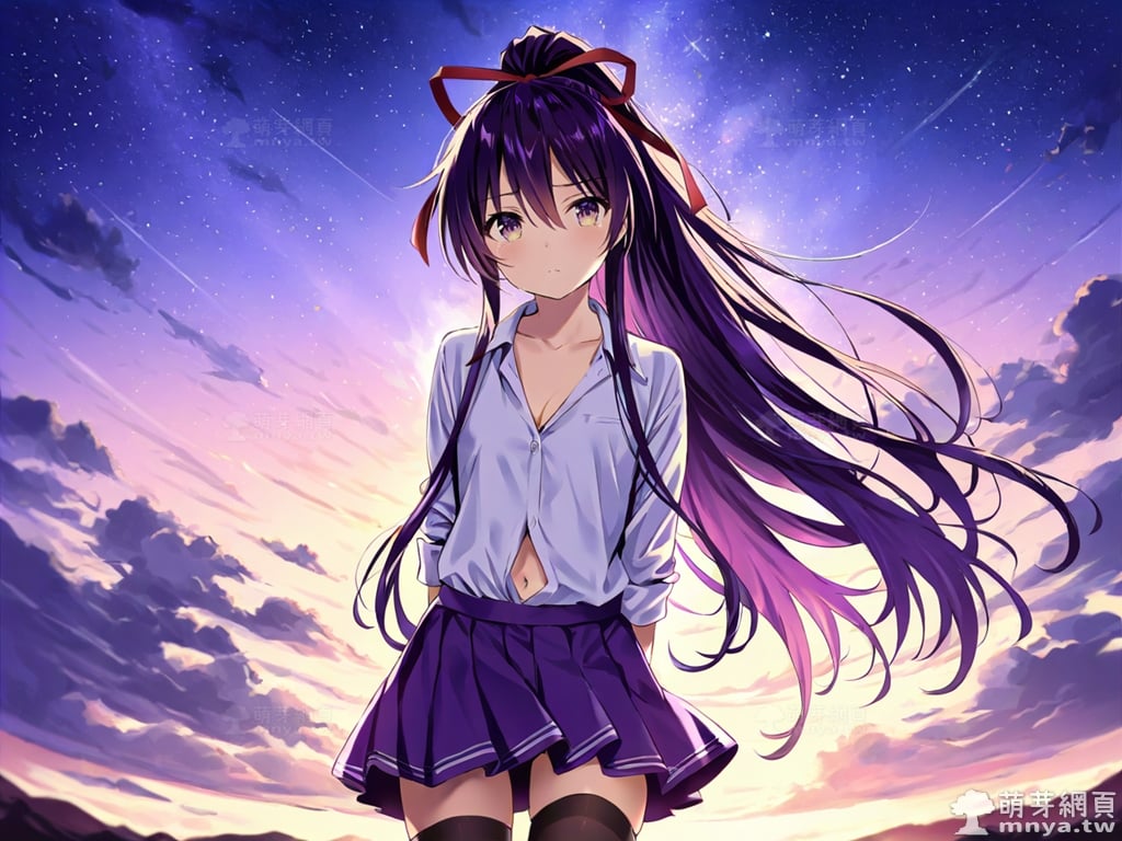 提詞文字:(masterpiece), (high quality), (high score), (great score), (year 2020), (kawaii), (loli), (photorealistic:0.1), 1girl, solo, (yatogami tohka), date a live, __posture__, long hair, very long hair, purple hair, high ponytail, ponytail, hair ribbon, red ribbon, hair between eyes, gradient eyes, purple eyes, yellow eyes, school uniform, white shirt, collared shirt, shirt, pleated skirt, purple skirt, skirt, long sleeves, black thighhighs, thighhighs, zettai ryouiki, collarbone, cleavage, navel, medium breasts, breasts, cowboy shot, __looking__, __expression__, __background__.