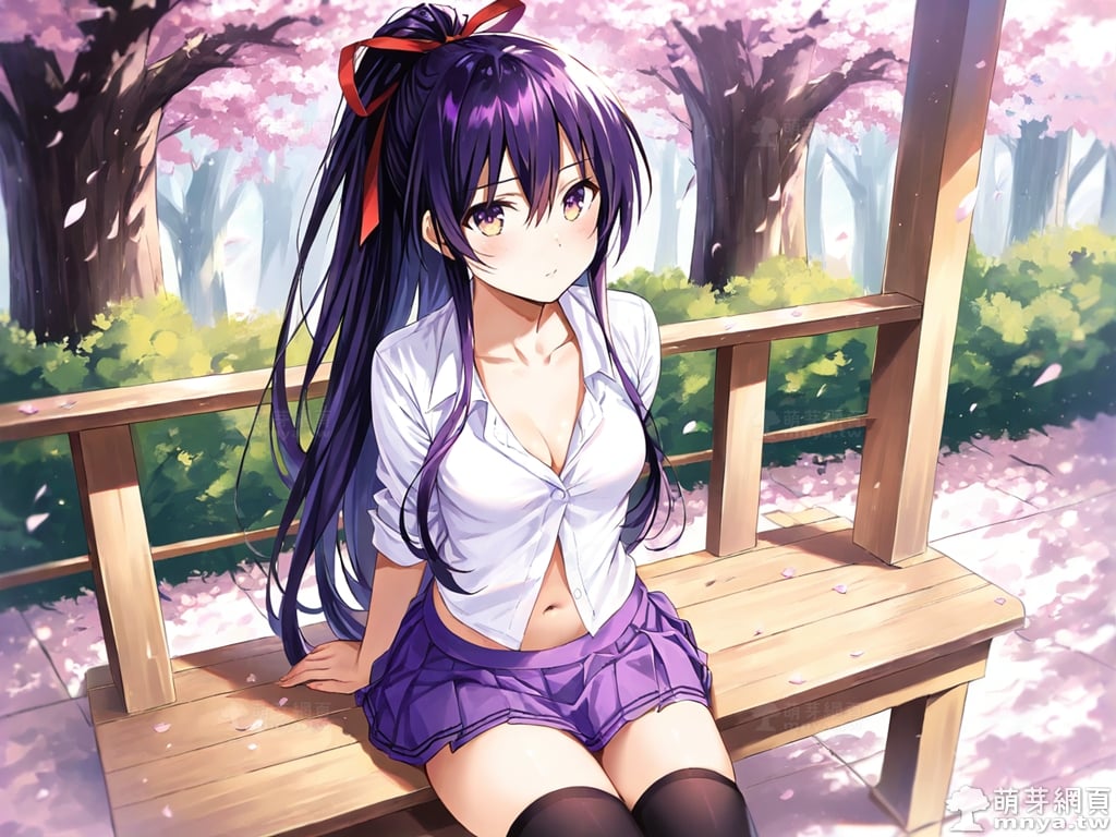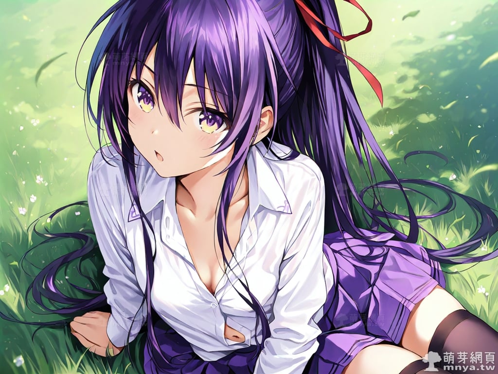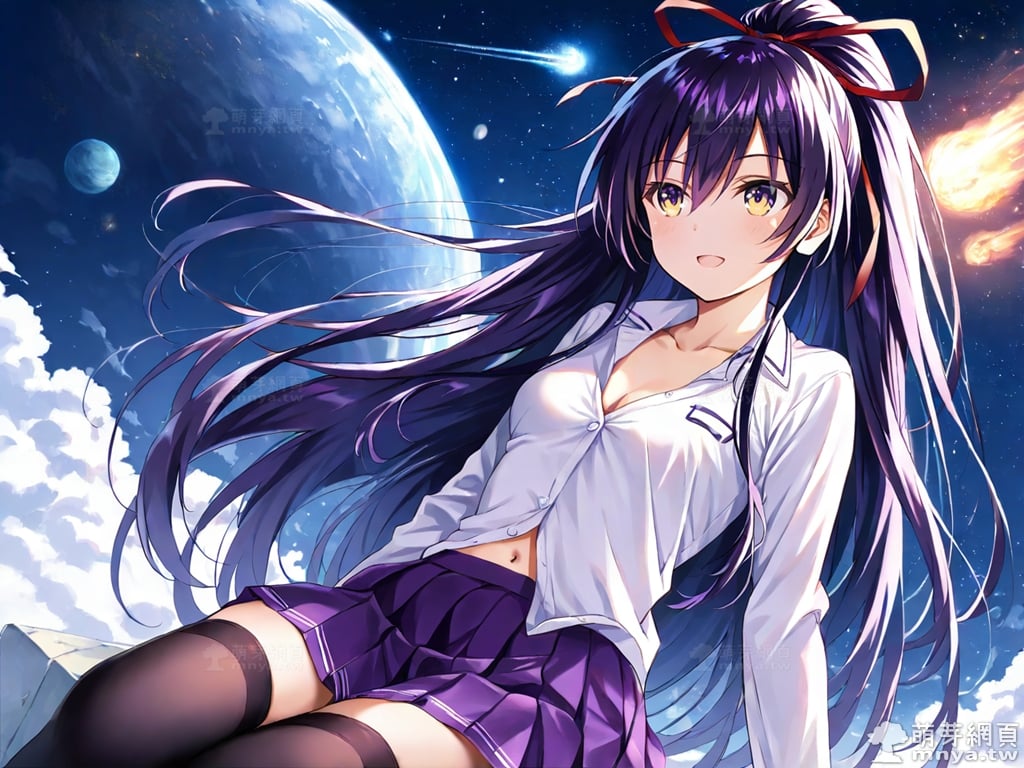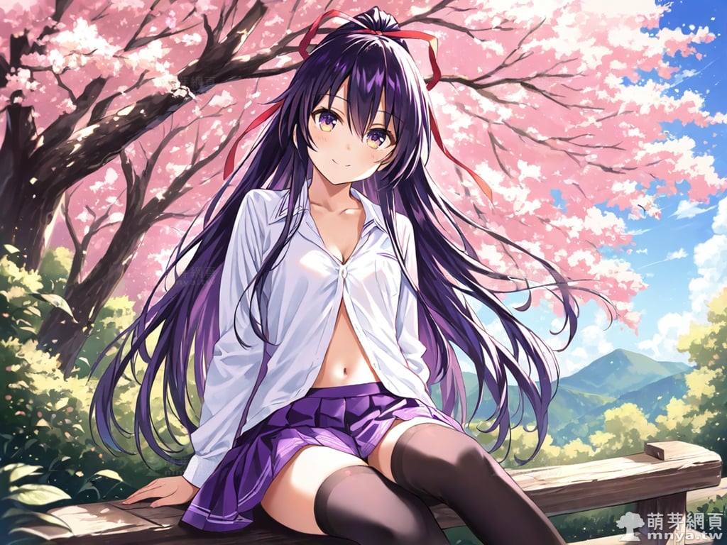 提詞文字:(masterpiece), (high quality), (high score), (great score), (year 2020), (kawaii), (loli), (photorealistic:0.1), 1girl, solo, (yatogami tohka), date a live, __posture__, long hair, very long hair, purple hair, high ponytail, ponytail, hair ribbon, red ribbon, hair between eyes, gradient eyes, purple eyes, yellow eyes, school uniform, white shirt, collared shirt, shirt, pleated skirt, purple skirt, skirt, long sleeves, black thighhighs, thighhighs, zettai ryouiki, collarbone, cleavage, navel, medium breasts, breasts, cowboy shot, __looking__, __expression__, __background__.