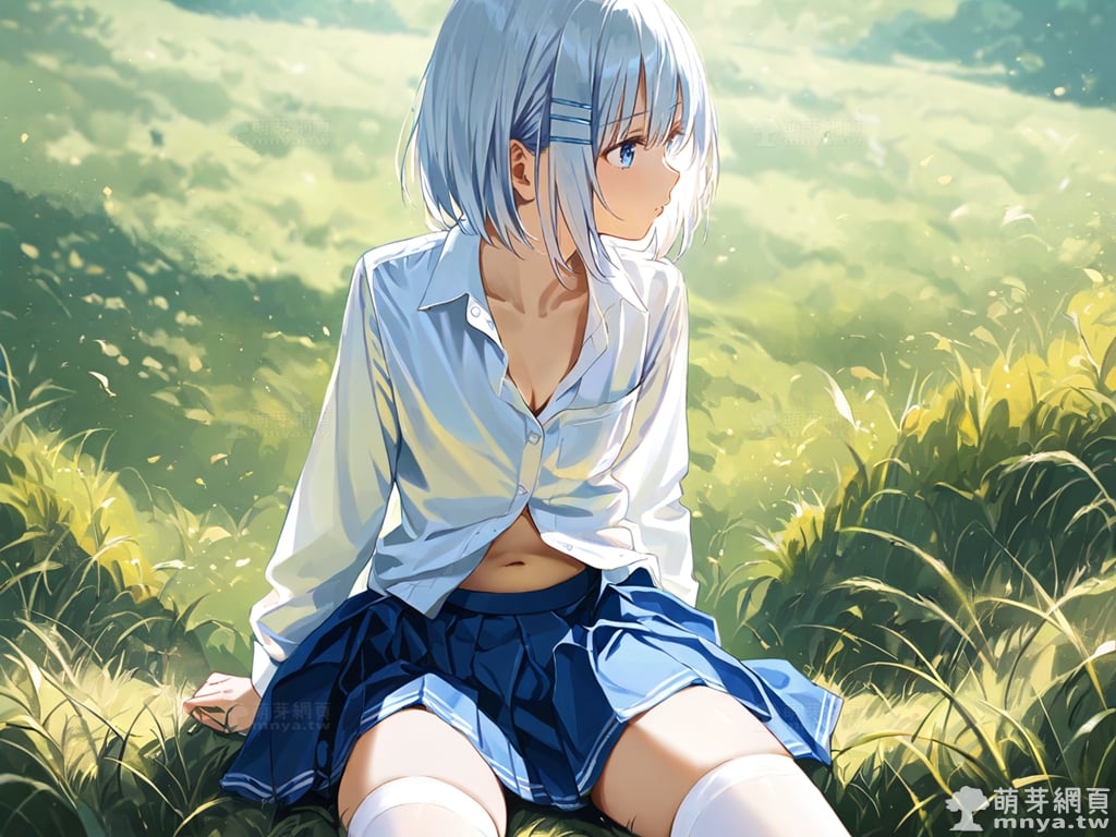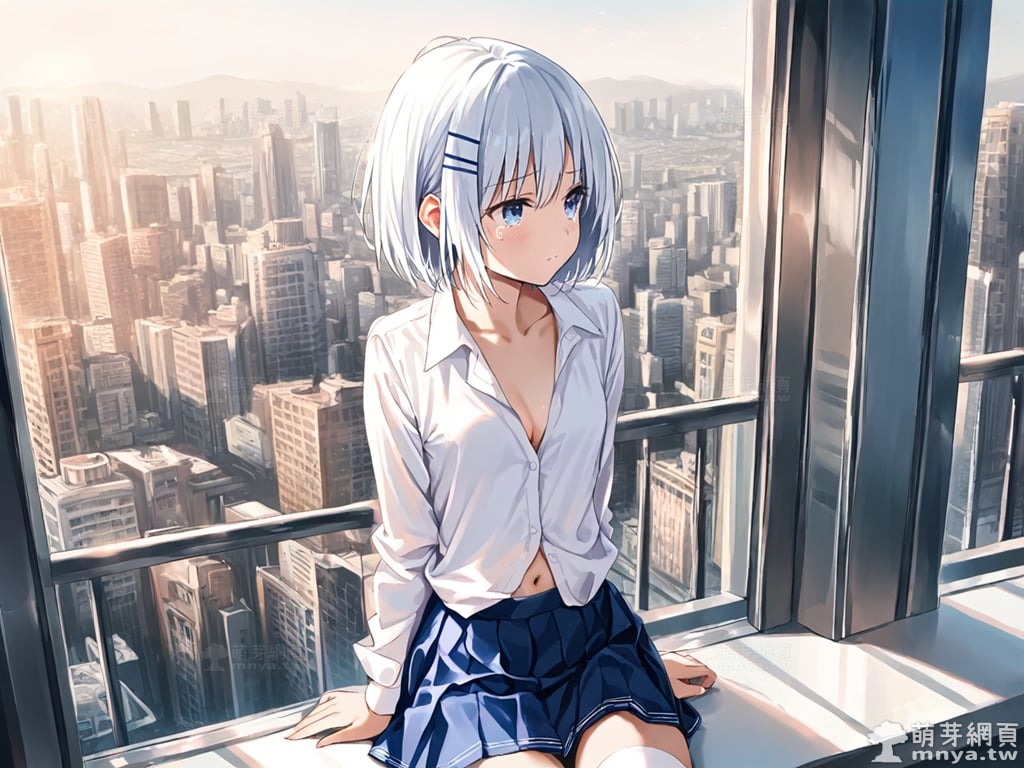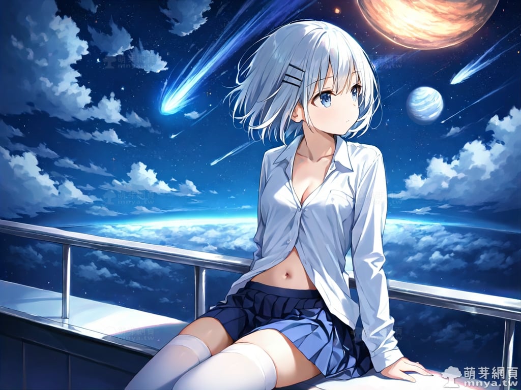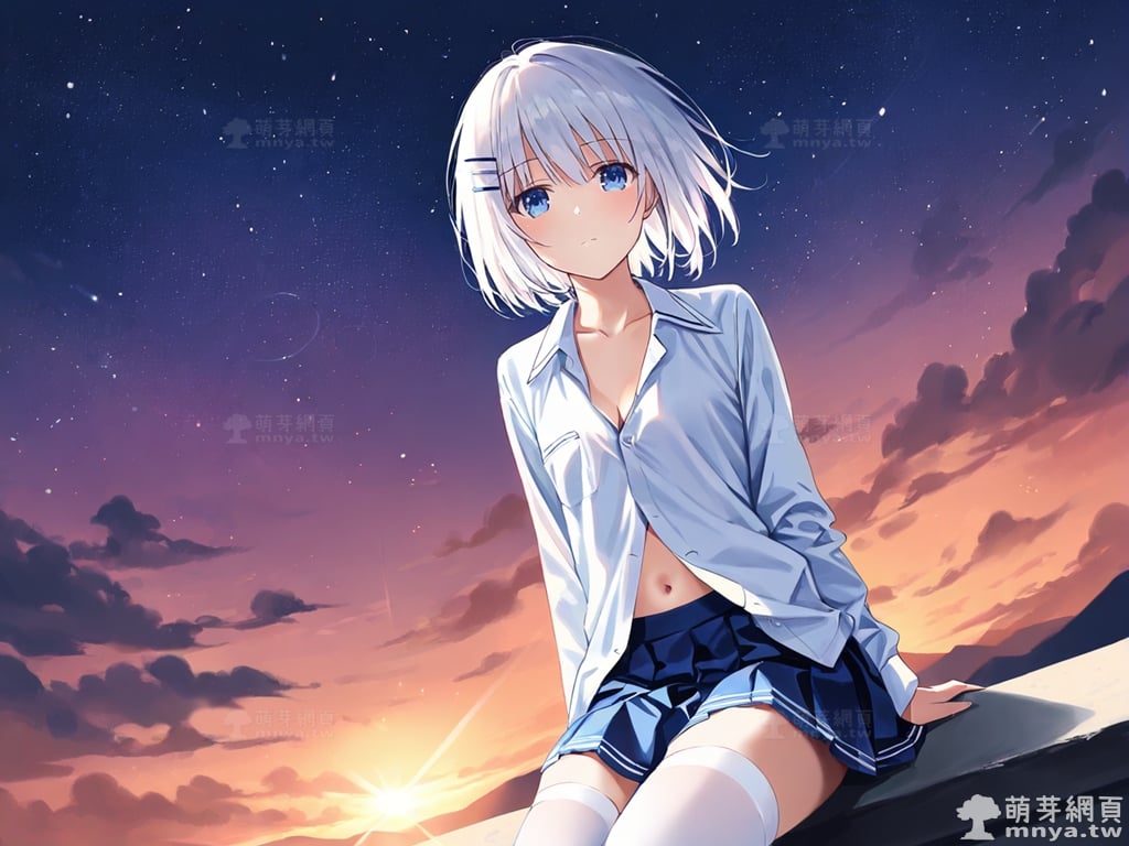 提詞文字:(masterpiece), (high quality), (high score), (great score), (year 2020), (kawaii), (loli), (photorealistic:0.1), 1girl, solo, (tobiichi origami), date a live, __posture__, short hair, white hair, hairclip, blue eyes , school uniform, white shirt, collared shirt, shirt, pleated skirt, blue skirt, skirt, long sleeves, white thighhighs, thighhighs, zettai ryouiki, collarbone, cleavage, navel, medium breasts, breasts, cowboy shot, __looking__, __expression__, __background__.