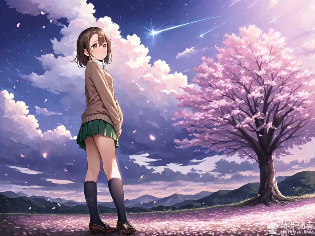 __background__:outdoors, starry sky, night sky, sunset\nnight, night sky, cloudy sky, meteor, planet, cloud, star (sky), (starry sky:1.2)\n(outdoors), day, blue sky, cloud, nature, tree\noutdoors, day, blue sky, cloud, water\noutdoors, day, grass\ncherry blossoms, tree, outdoors, shooting star, petals, cloud\noutdoors, city, cityscape, scenery, building