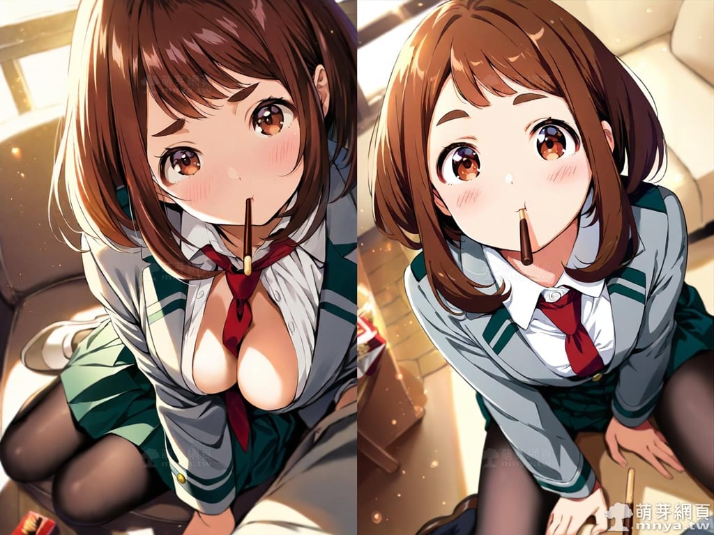 提詞文字:(masterpiece), (high quality), (high score), (great score), (year 2020), (kawaii), (loli), (photorealistic:0.1), (anime coloring), 1girl, solo, (uraraka ochako:1.2), short hair, brown hair, brown eyes, u.a. school uniform, school uniform, pantyhose, necktie, red necktie, pleated skirt, skirt, black pantyhose, collared shirt, white shirt, shirt, shoes, long sleeves, green skirt, blazer, large breasts, breasts, looking at viewer, mouth hold, sitting, food in mouth, leaning forward, pocky kiss, arm support, all fours, holding food, feeding, closed mouth, looking up, downblouse, head tilt, holding, hand between legs, eating, food, pocky, blush, pocky day, shared food, incoming pocky kiss, chocolate, indoors, from above, day, blurry, dutch angle, blurry background, upper body, pov, couch, sunlight, chair, window, light particles, depth of field
