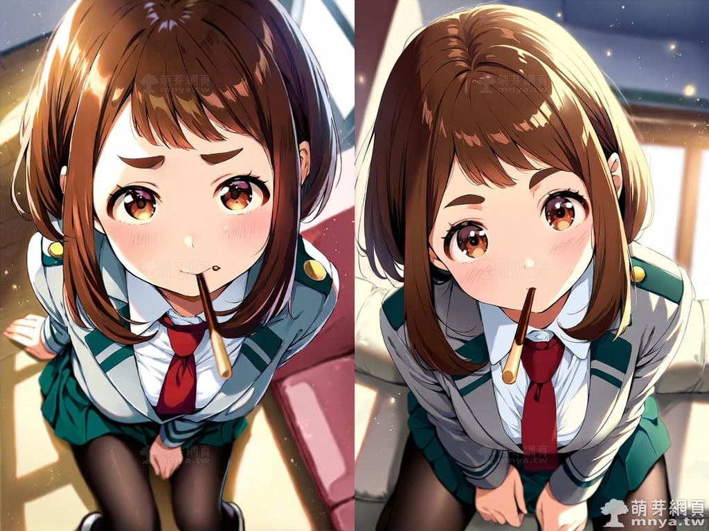 此次的目標是在「我的英雄學院」(僕のヒーローアカデミア,My Hero Academia)登場的「麗日御茶子」(麗日 お茶子,Uraraka Ochaco),生日為 12 月 27 日(摩羯座)、身高 156cm、血型 B 型,出身於三重縣,畢業於露座柳中學,喜歡星空和和食。她是一位留著清爽茶色鮑伯頭的少女,雙眼有著一雙與髮色相稱的茶色瞳孔,面容總是帶著開朗的笑容。她的性格明亮大方,說話時會帶有可愛的關西腔,是班上的活力來源。她立志成為英雄是為了賺錢改善家裡建築公司的困境,讓父母過上輕鬆的生活。這裡獻上正在玩 Pocky Game 含食俯身的御茶子。使用 SDXL 模型直接生成,效果很不錯。總共產生 100 張,挑掉不合理跟瑕疵較多的有 6 張如下提供大家參考。