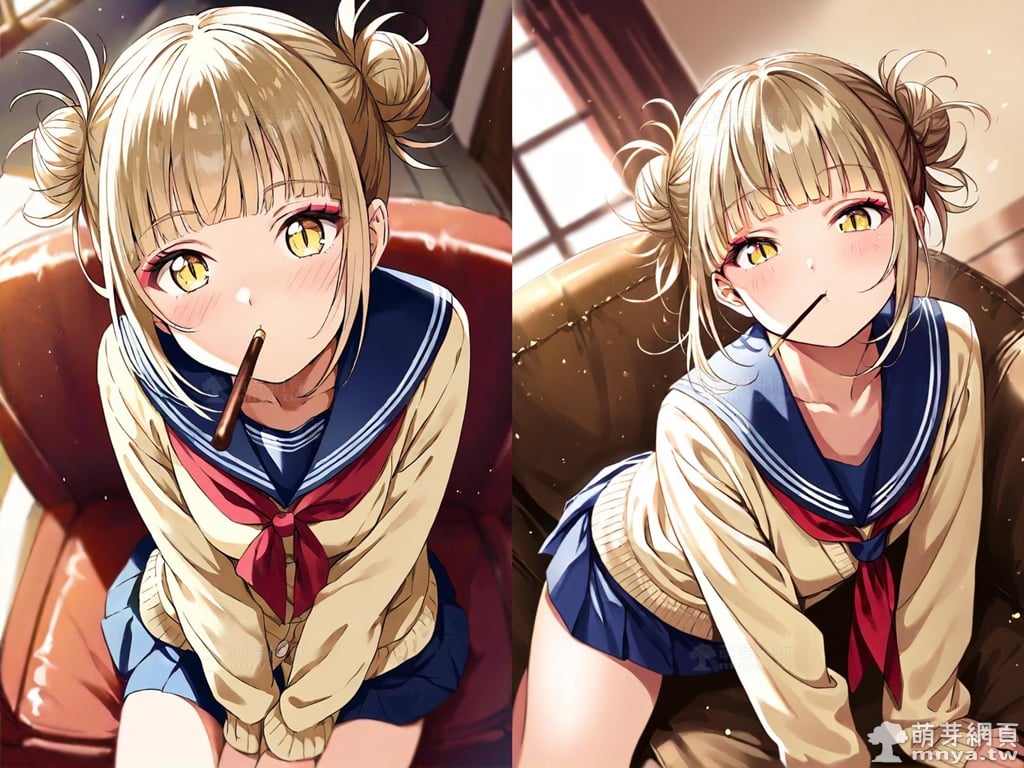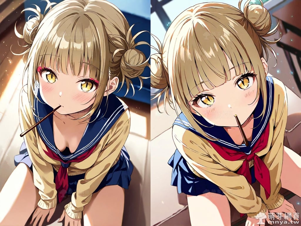提詞文字:(masterpiece), (high quality), (high score), (great score), (year 2020), (kawaii), (loli), (photorealistic:0.1), (anime coloring), 1girl, solo, (toga himiko:1.3), short hair, messy hair, blonde hair, blunt bangs, bangs, hair bun, double bun, fangs, yellow eyes, slit pupils, eyeshadow, long sleeves, red neckerchief, neckerchief, blue sailor collar, sailor collar, school uniform, yellow cardigan, cardigan, miniskirt, blue skirt, pleated skirt, skirt, thighs, large breasts, breasts, looking at viewer, mouth hold, sitting, food in mouth, leaning forward, pocky kiss, arm support, all fours, holding food, feeding, closed mouth, looking up, downblouse, head tilt, holding, hand between legs, eating, food, pocky, blush, pocky day, shared food, incoming pocky kiss, chocolate, indoors, from above, day, blurry, dutch angle, blurry background, upper body, pov, couch, sunlight, chair, window, light particles, depth of field
