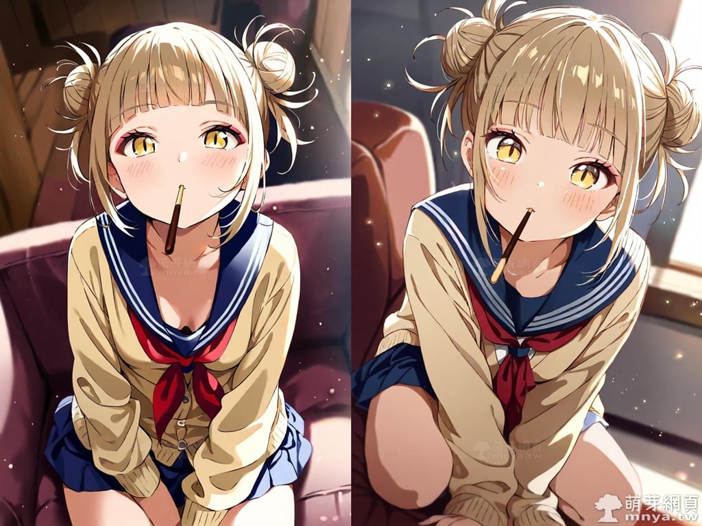 此次的目標是在「我的英雄學院」(僕のヒーローアカデミア,My Hero Academia)登場的「渡我被身子」(渡我 被身子,Toga Himiko),年齡 17 歲、身高 157cm 的少女,生日在 8 月 7 日,喜歡的事物是血、石榴和傷口。她是「敵人聯軍」的一員,擁有宛如吸血鬼般的虎牙,外表看起來像一位可愛的高校女生。她的髮型是一頭淺金色的亂髮,通常將頭髮紮成兩團蓬鬆的髮髻,給人一種既甜美又帶著古怪氣息的印象。搭配那雙有著病態偏執感的黃色或金褐色瞳色,以及常常在臉上見到的緋紅(臉紅)和血液痕跡,完整呈現了她內在的扭曲與對「愛」的獨特詮釋。她既是連續致死事件的通緝犯,也是讓出久最頭痛的敵人之一,特別崇拜英雄殺手,並對遍體鱗傷且散發血之芬芳的人懷有強烈的愛意。這裡獻上正在玩 Pocky Game 含食俯身的被身子。使用 SDXL 模型直接生成,效果很不錯。總共產生 100 張,挑掉不合理跟瑕疵較多的有 18 張如下提供大家參考。