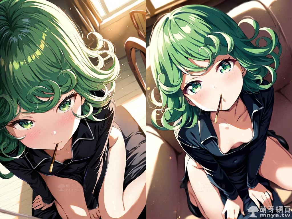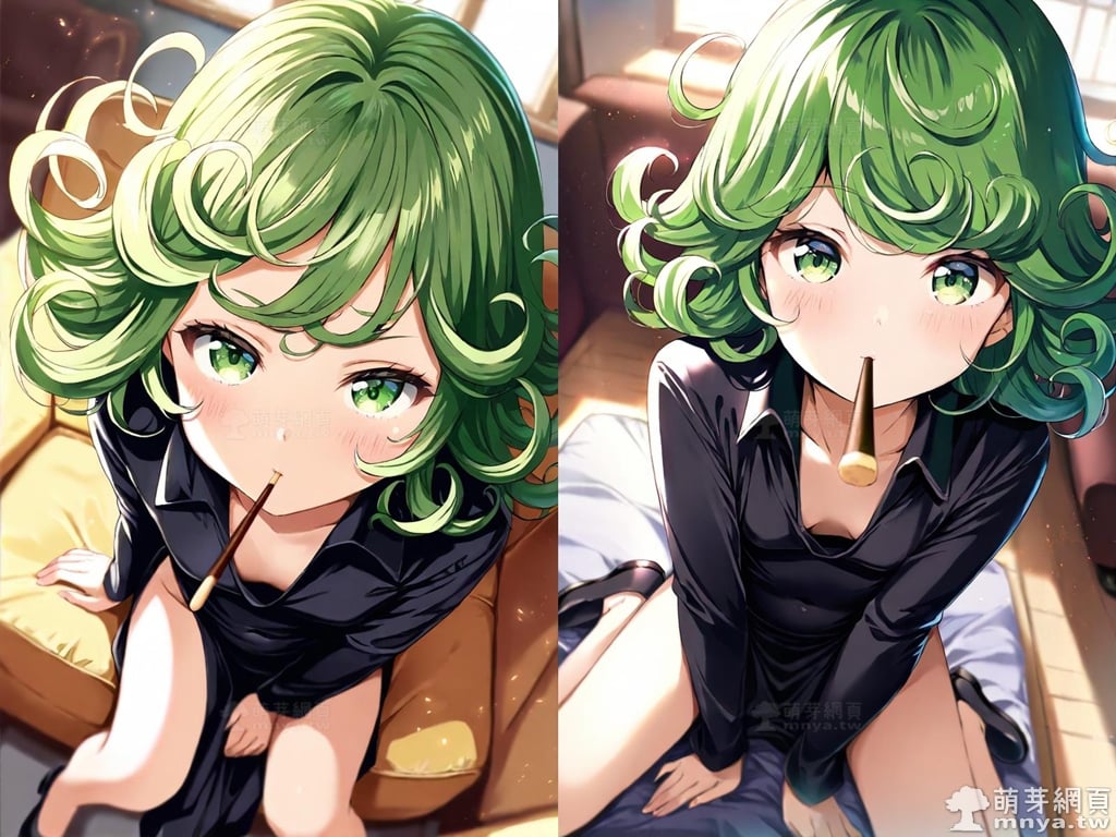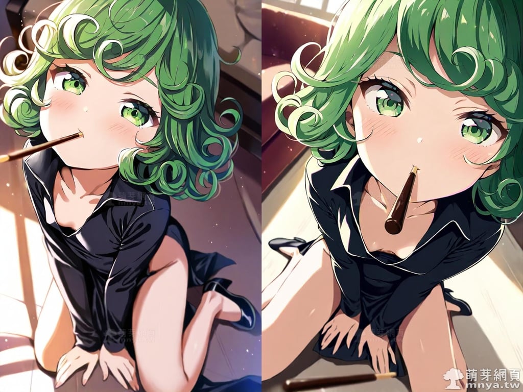 此次的目標是在「一拳超人」(ワンパンマン,One-Punch Man)登場的「龍卷」(タツマキ,Tatsumaki),英雄稱號為戰慄的龍卷(戦慄のタツマキ),在英雄協會中是 S 級 2 位的青年女性英雄,年齡為 28 歲。儘管她實際年齡已屆輕熟,但她的外貌卻非常嬌小,因此極度厭惡被人當成小孩看待。龍卷的特徵是一頭張揚、蓬鬆的綠色捲髮,長度及肩,搭配她銳利且同樣為翡翠般的綠色瞳孔,散發著強大的氣場。她平時穿著一件開高衩的黑色長洋裝。作為英雄協會的「最終兵器」,她擁有遠超 S 級水準的強大超能力,足以單挑龍級巔峰的怪人。她以超能力為戰鬥方式,能輕易操縱巨大瓦礫和飛彈,並將敵人扭曲成螺旋狀,這也是她英雄稱號的由來。她是吹雪的姊姊,對妹妹有著近乎扭曲的保護欲,雖然她認為其他英雄只是拖後腿的存在,但在危急時刻仍會出手相助。這裡獻上正在玩 Pocky Game 含食俯身的龍卷。使用 SDXL 模型直接生成,效果很不錯。總共產生 100 張,挑掉不合理跟瑕疵較多的有 8 張如下提供大家參考。