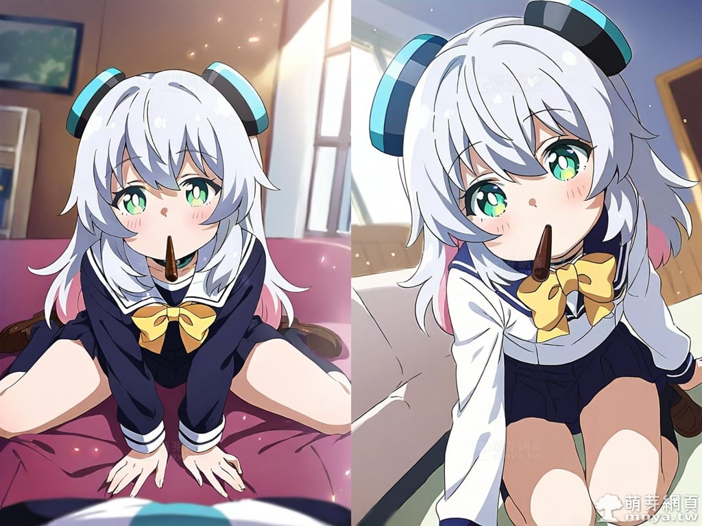 提詞文字:(masterpiece), (high quality), (high score), (great score), (year 2020), (kawaii), (loli), (photorealistic:0.1), (anime coloring), 1girl, solo, (alma chan:1.3), long hair, grey hair, pink hair, two-tone hair, multicolored hair, (hair ornament:1.2), (smokestack hair ornament:1.5), sidelocks, bangs, hair between eyes, aqua eyes, green eyes, bright pupils, expressionless, skirt, socks, (school uniform), yellow bowtie, bowtie, yellow bow, bow, loafers, brown footwear, black socks, kneehighs, long sleeves, black skirt, pleated skirt, black choker, choker, small breasts, breasts, looking at viewer, mouth hold, sitting, food in mouth, leaning forward, pocky kiss, arm support, all fours, holding food, feeding, closed mouth, looking up, downblouse, head tilt, holding, hand between legs, eating, food, pocky, blush, pocky day, shared food, incoming pocky kiss, chocolate, indoors, from above, day, blurry, dutch angle, blurry background, upper body, pov, couch, sunlight, chair, window, light particles, depth of field <lora:alma_chan_XL:1.3>