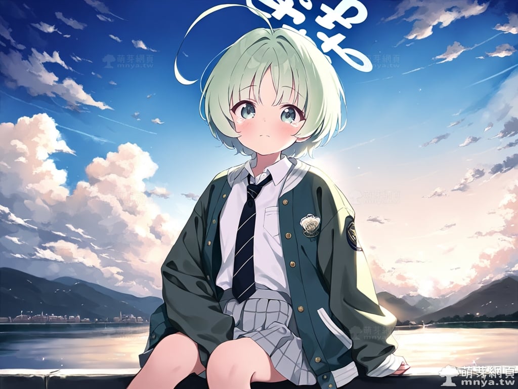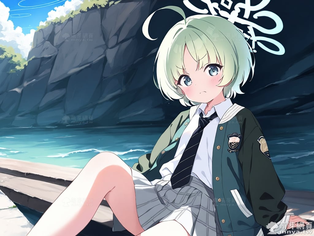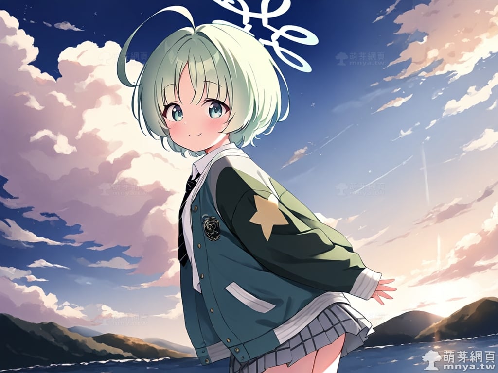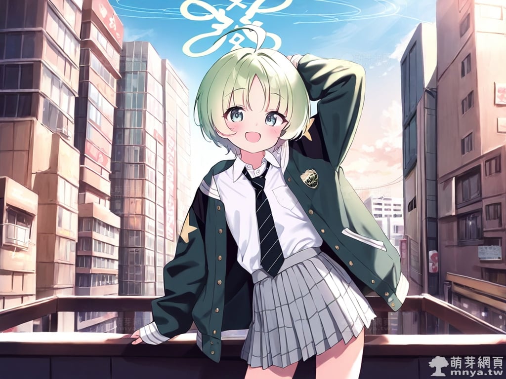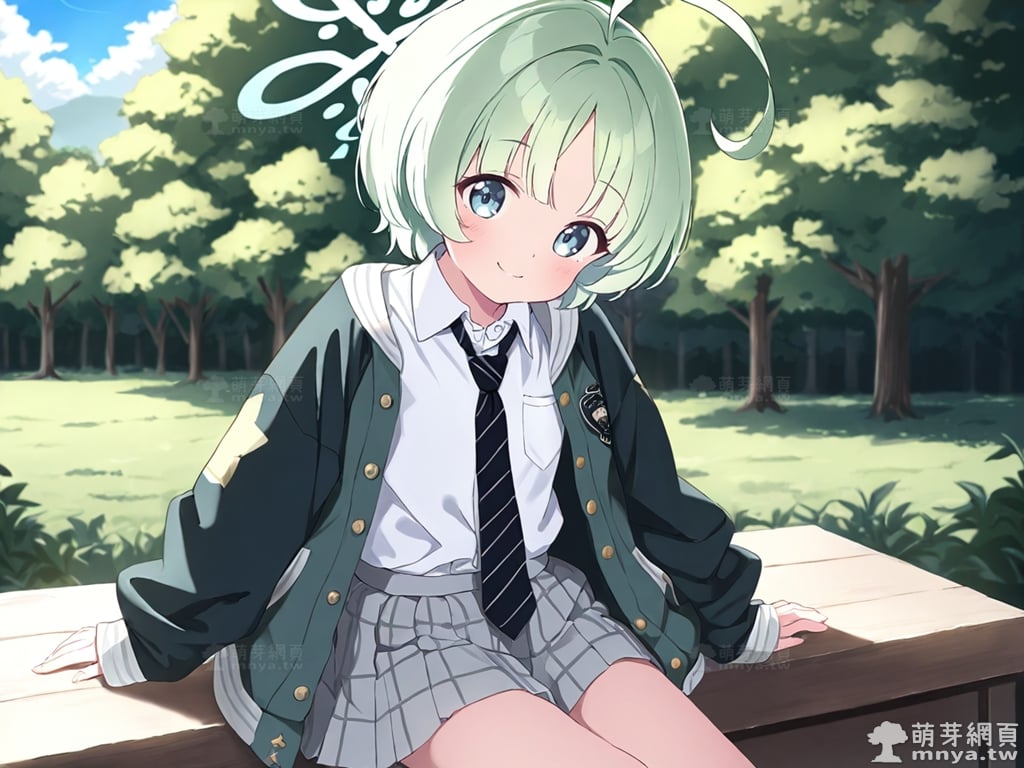 提詞文字:(masterpiece), (high quality), (high score), (great score), (year 2020), (kawaii), (loli), (photorealistic:0.1), 1girl, solo, (usuba ritsu:1.2), blue archive, __posture__, short hair, hair intakes, green hair, blunt bangs, parted bangs, ahoge, huge ahoge, green eyes, aqua halo, halo, black necktie, necktie, diagonal-striped necktie, collared shirt, diagonal-striped clothes, dress shirt, green jacket, grey skirt, jacket, miniskirt, open clothes, open jacket, plaid clothes, plaid skirt, pleated skirt, school uniform, shirt, skirt, sleeves past wrists, striped clothes, white shirt, long sleeves, star \(symbol\), small breasts, breasts, cowboy shot, __looking__, __expression__, __background__. <lora:usuba_ritsu_XL:1>