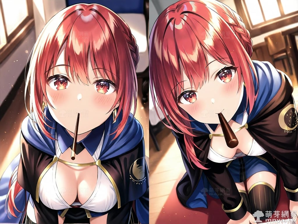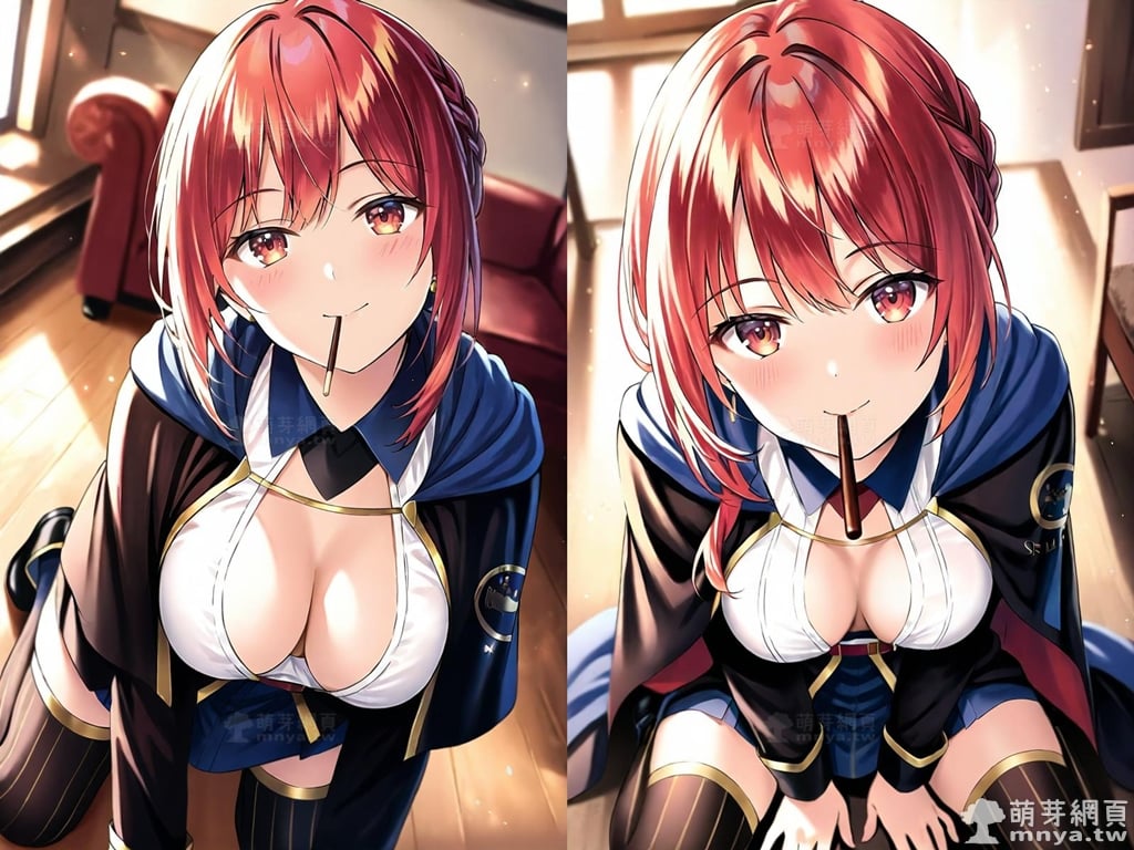 提詞文字:(masterpiece), (high quality), (high score), (great score), (year 2020), (kawaii), (loli), (photorealistic:0.1), (anime coloring), 1girl, solo, (selma claudel:1.2), long hair, very long hair, red hair, bangs, braid, sidelocks, ribbon, black ribbon, hair ribbon, low ponytail, ponytail, hair between eyes, red eyes, jewelry, earrings, blue belt, belt, belt buckle, buckle, black cape, (blue cape:1.3), (two-sided cape:1.5), cape, black cloak, cloak, collared shirt, white shirt, shirt, long sleeves, black skirt, high-waist skirt, skirt, thighhighs, striped thighhighs, black thighhighs, vertical-striped thighhighs, black footwear, boots, large breasts, breasts, looking at viewer, mouth hold, sitting, food in mouth, leaning forward, pocky kiss, arm support, all fours, holding food, feeding, closed mouth, looking up, downblouse, head tilt, holding, hand between legs, eating, food, pocky, blush, pocky day, shared food, incoming pocky kiss, chocolate, indoors, from above, day, blurry, dutch angle, blurry background, upper body, pov, couch, sunlight, chair, window, light particles, depth of field <lora:selma_claudel_XL:1.2>