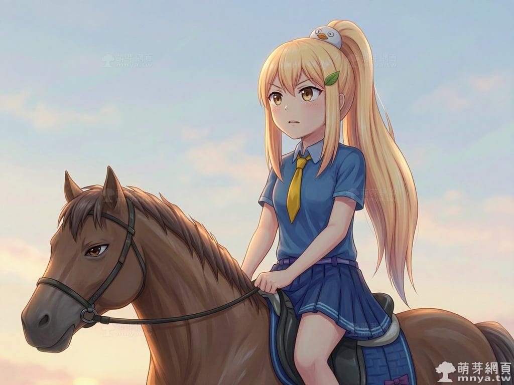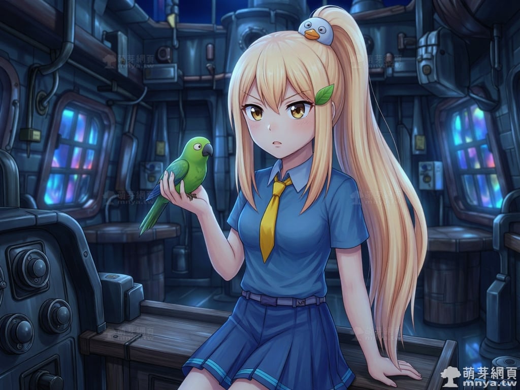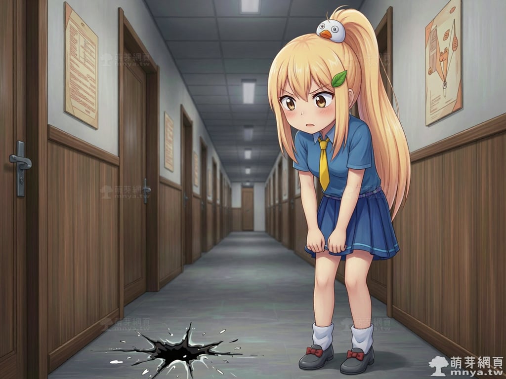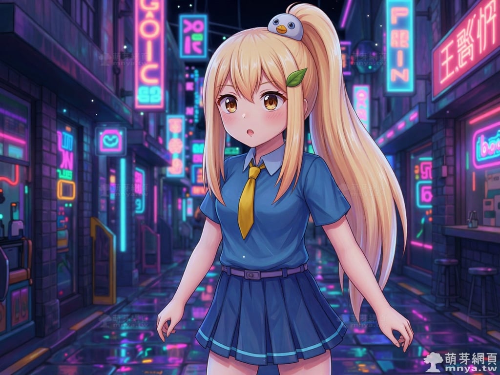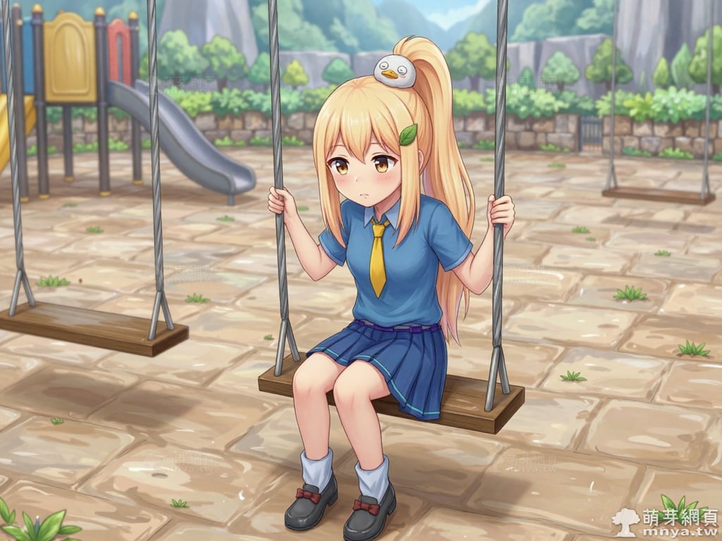 提詞文字:masterpiece, high quality, anime, (block_duck_niang_z:2), blonde hair, warm orange-yellow hair tone, long hair, high ponytail, (round white bird hair ornament with a simple round eyes and small orange beak), a green leaf hairclip, brown eyes, wearing a blue short-sleeved collared school shirt with light blue trim on the cuffs, yellow necktie, navy blue pleated skirt with light blue horizontal stripes on the hem, a light purple belt strap threaded through multiple dark purple belt loops, short bubble socks, white socks, grey loafers with red ribbon bows, __1000prompts__. <lora:block_duck_niang_z_000001800>