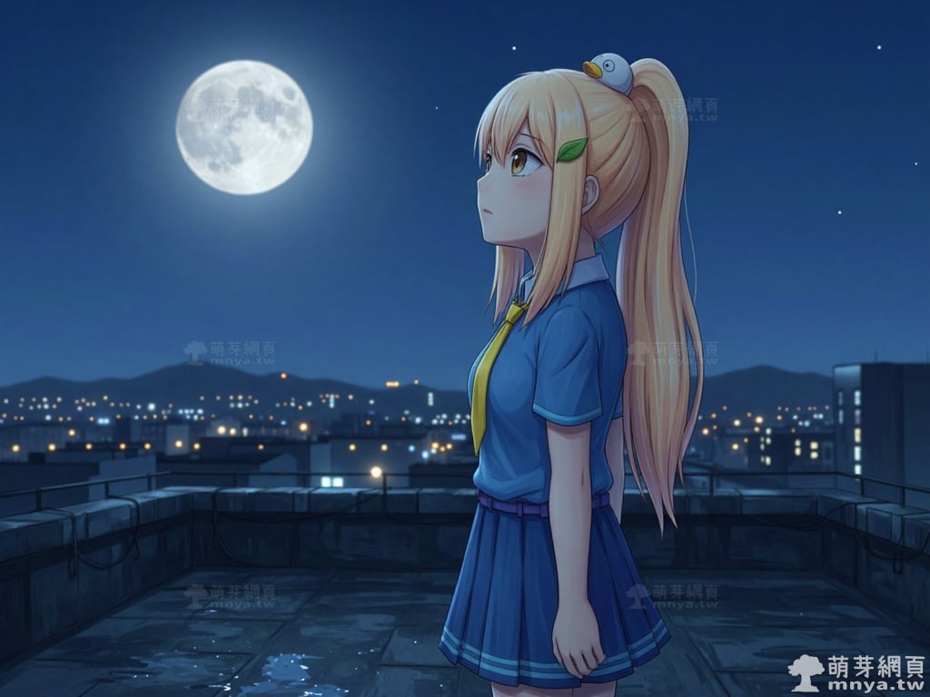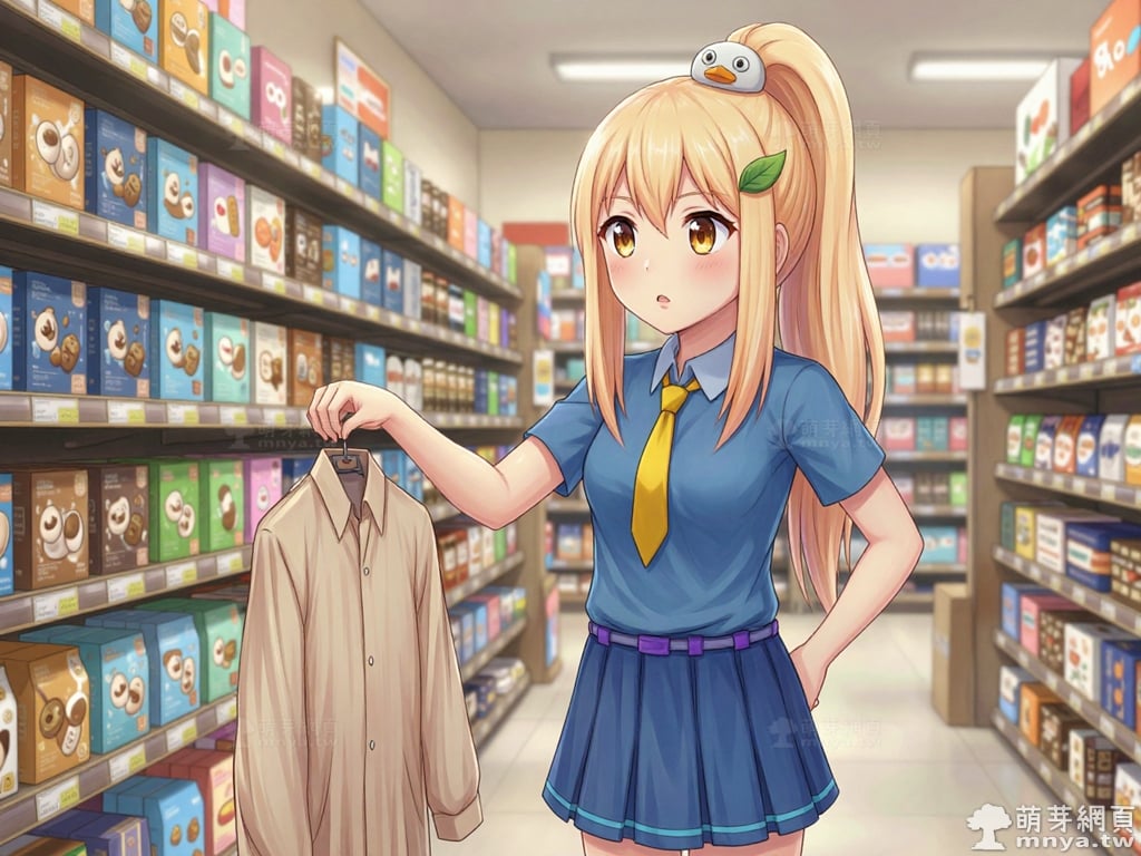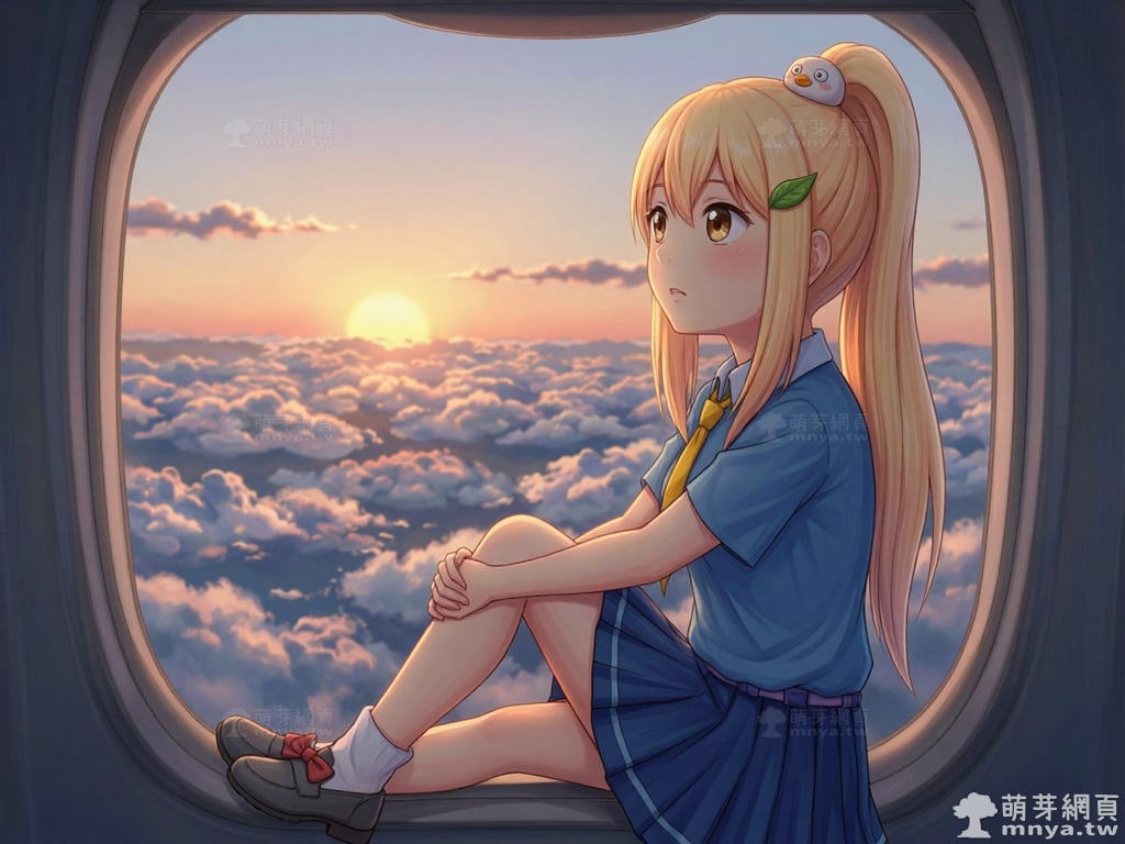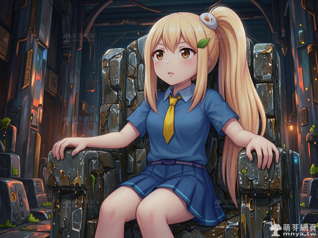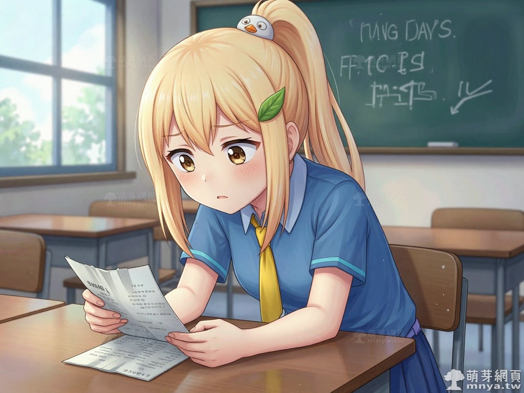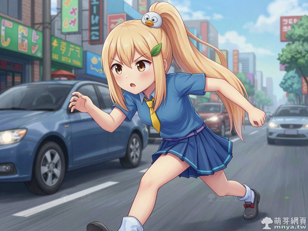 提詞文字:masterpiece, high quality, anime, (block_duck_niang_z:2), blonde hair, warm orange-yellow hair tone, long hair, high ponytail, (round white bird hair ornament with a simple round eyes and small orange beak), a green leaf hairclip, brown eyes, wearing a blue short-sleeved collared school shirt with light blue trim on the cuffs, yellow necktie, navy blue pleated skirt with light blue horizontal stripes on the hem, a light purple belt strap threaded through multiple dark purple belt loops, short bubble socks, white socks, grey loafers with red ribbon bows, __1000prompts__. <lora:block_duck_niang_z_000001800>