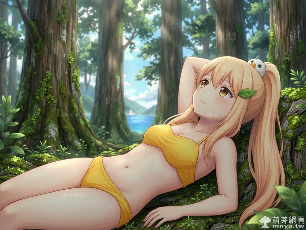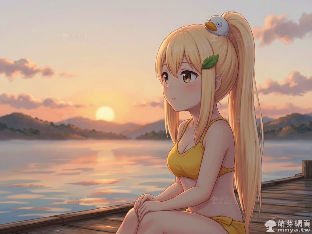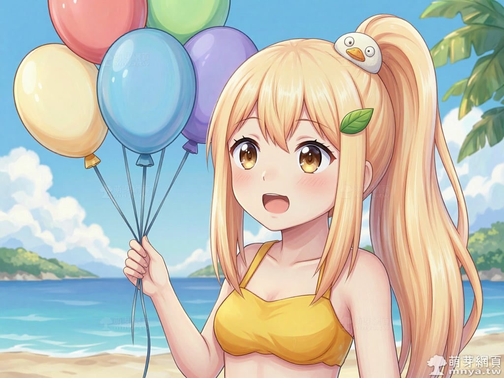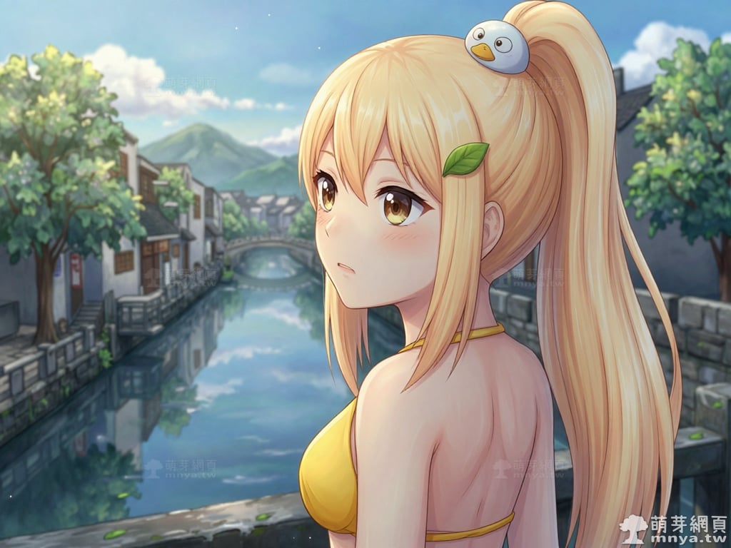 提詞文字:masterpiece, high quality, anime, (block_duck_niang_z:2), blonde hair, warm orange-yellow hair tone, long hair, high ponytail, (round white bird hair ornament with a simple round eyes and small orange beak), a green leaf hairclip, brown eyes, yellow bikini, __1000promptsbikini__. <lora:block_duck_niang_z_000001800>