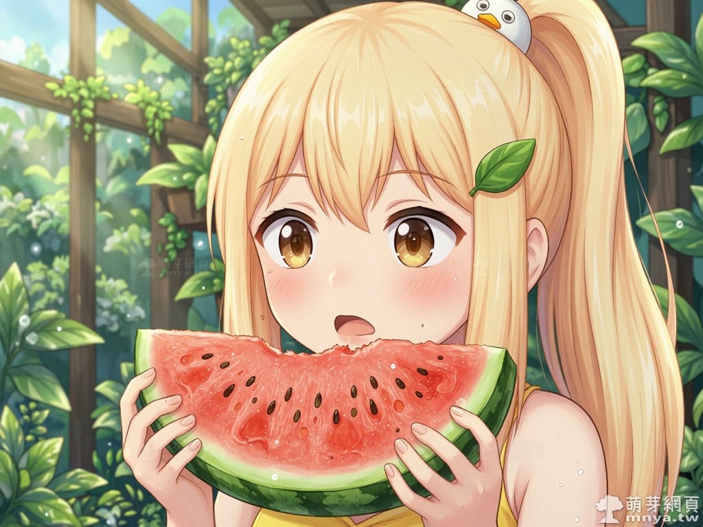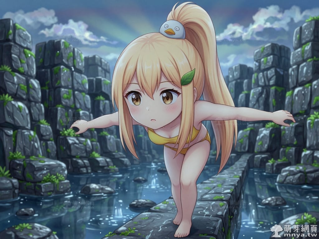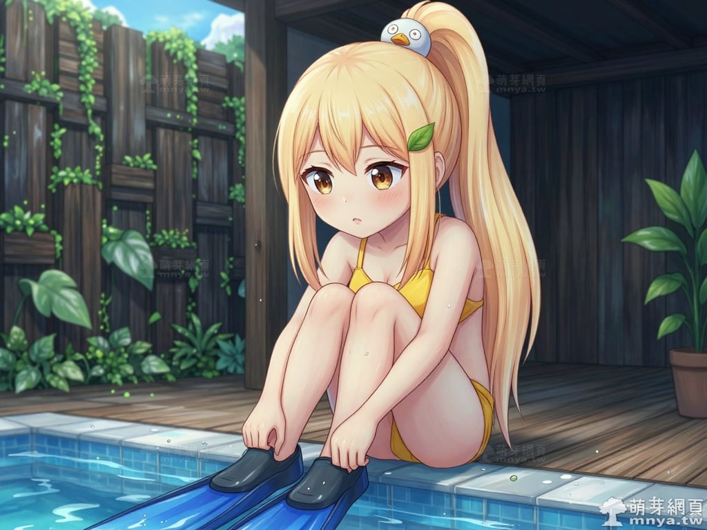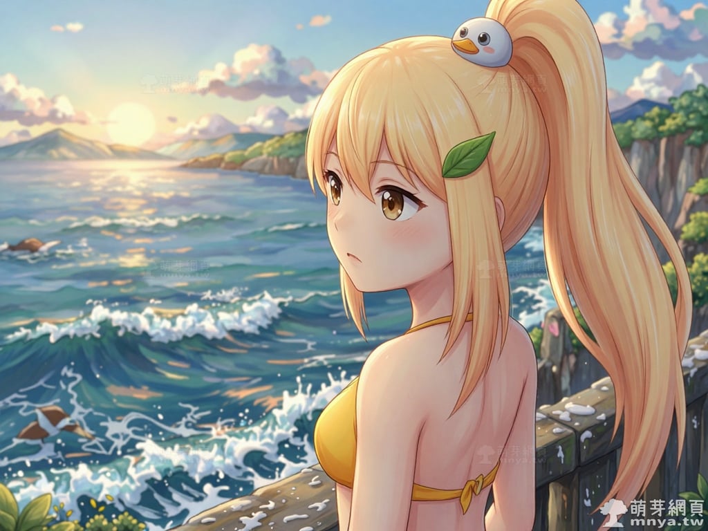 提詞文字:masterpiece, high quality, anime, (block_duck_niang_z:2), blonde hair, warm orange-yellow hair tone, long hair, high ponytail, (round white bird hair ornament with a simple round eyes and small orange beak), a green leaf hairclip, brown eyes, yellow bikini, __1000promptsbikini__. <lora:block_duck_niang_z_000001800>