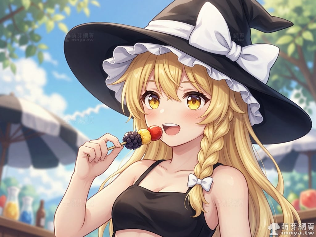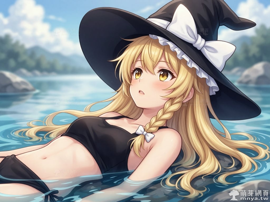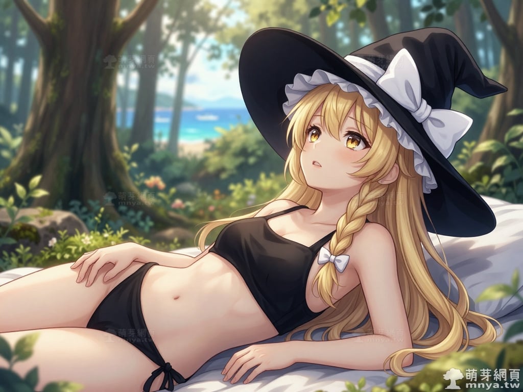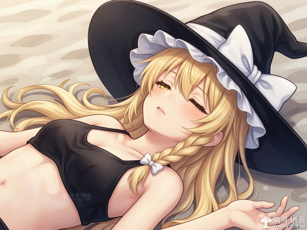 提詞文字:masterpiece, high quality, anime, (kirisame_marisa_z:2), long blonde hair, yellow eyes, side braid with a small white hair bow. Wearing an oversized black witch hat with a large white bow and ruffled inner lining. black bikini, __1000promptsbikini__. <lora:kirisame_marisa_z_000001800>