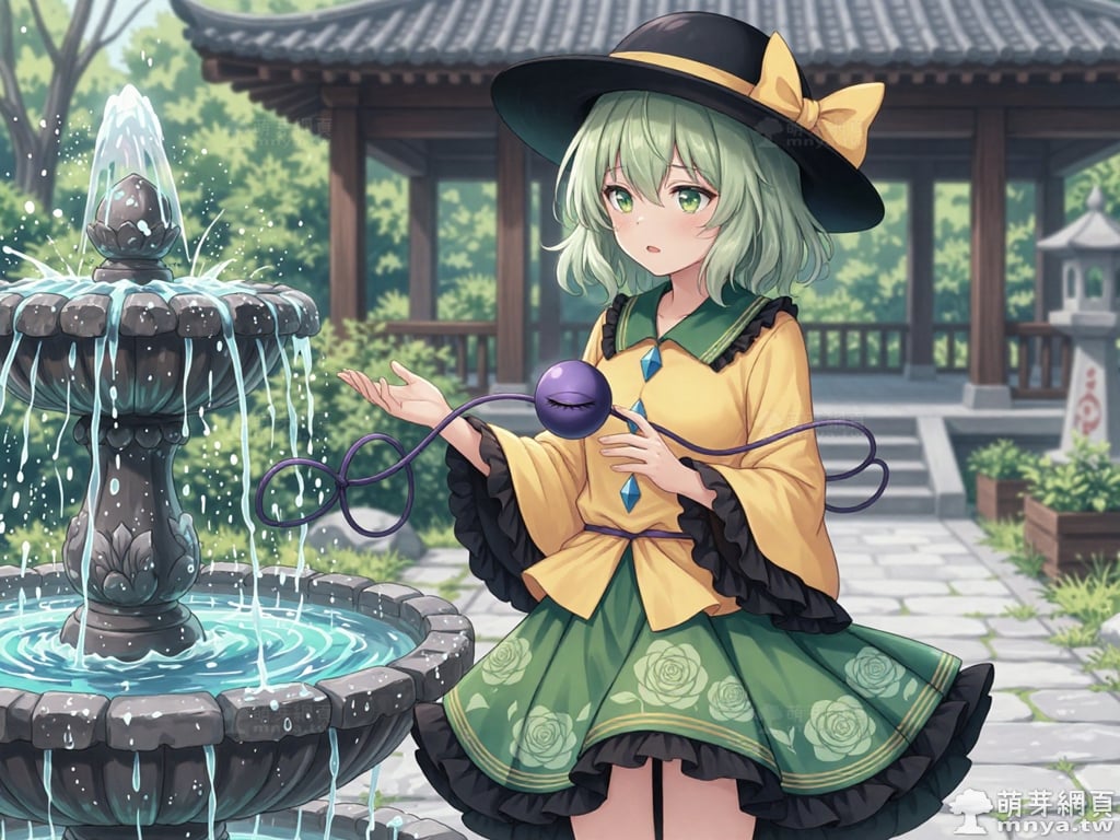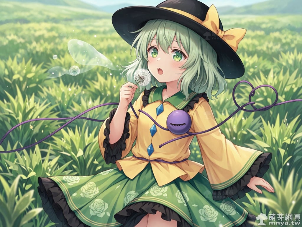 提詞文字:masterpiece, high quality, anime, (komeiji_koishi_z:2), short hair, green hair, hair between eyes, green eyes, black headwear, hat, wide-brimmed hat, bow, hat bow, yellow bow, yellow shirt, shirt, wide sleeves, long sleeves, frilled sleeves, collarbone, two blue diamond buttons on shirt, green skirt, skirt, floral print, rose print on skirt, frilled skirt, layered skirt, black ruffles on skirt hem, third eye, closed third eye, heart of string, purple string, floating object, __1000promptspro__. <lora:komeiji_koishi_z_000001800>
